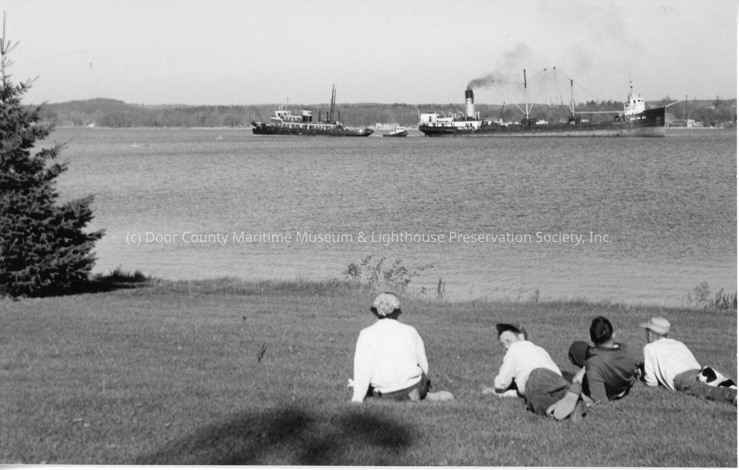 Four people on lawn watching tug between two vessels 1953