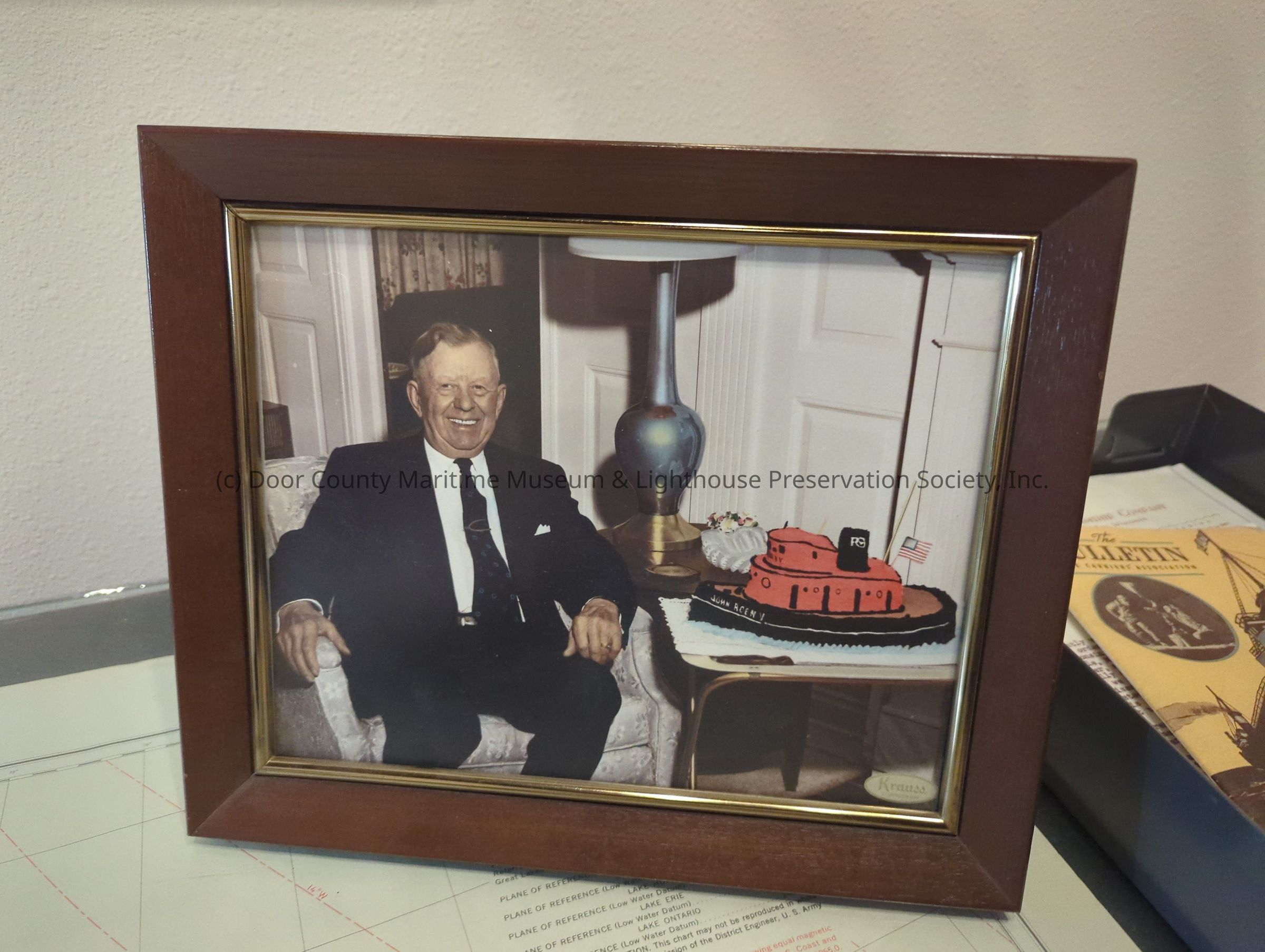 Framed photograph of captain John Roen sitting in chair with birthday cake in the shape of tug John Roen VLocation