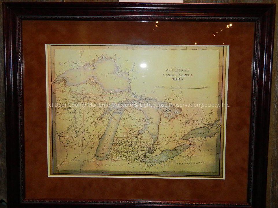 Chart of Michigan and the Great Lakes; 1835; yellow background; brown mat; brown frame; glass; wire hanger.