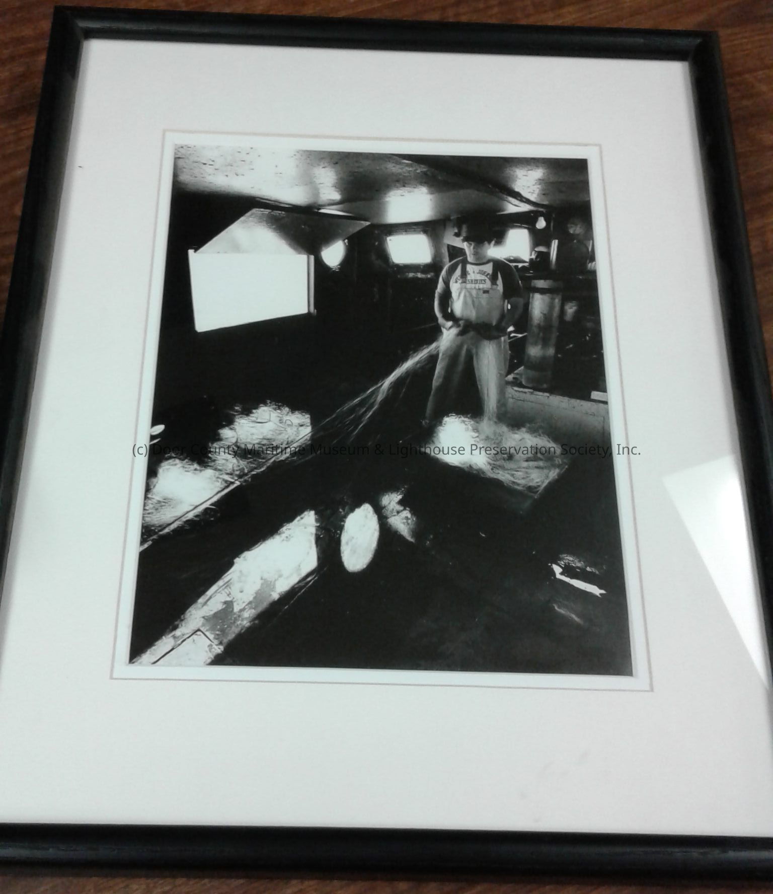 Framed photograph of Rick Johnson setting big mesh on bay of Green Bay aboard Freitag