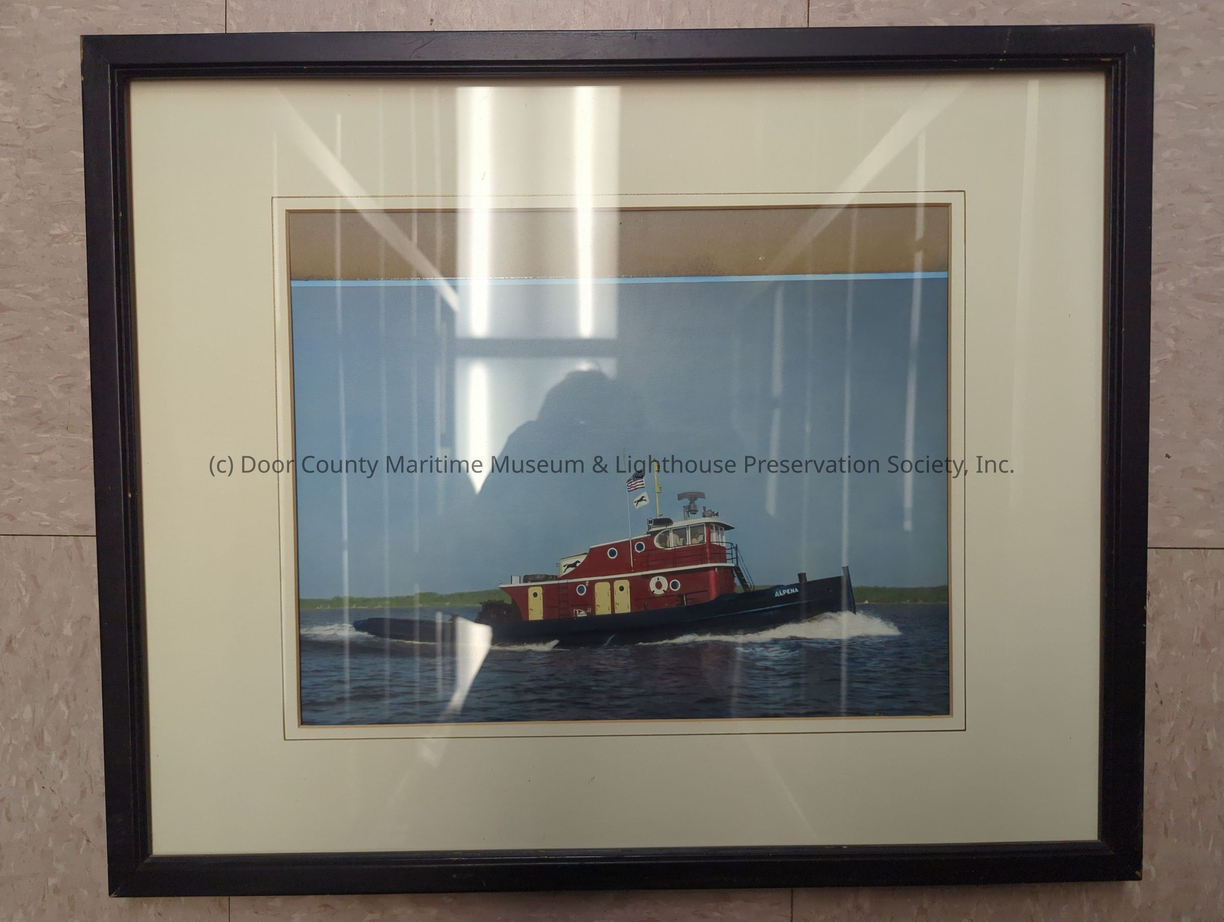 Framed photograph of the tug Alpena underway with land in the background. Black wooden frame with white card stock border. Glass front and cardboard backingLocation