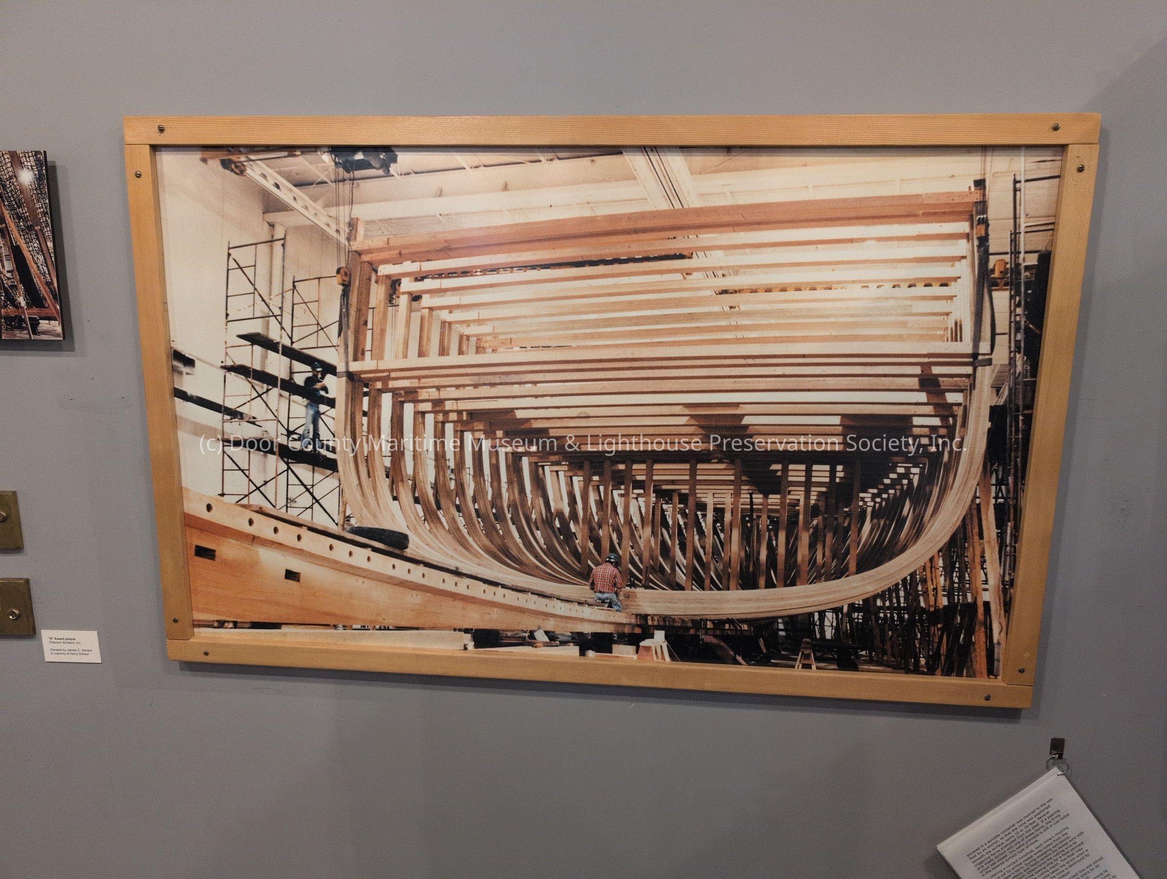 Color photograph of MCM frame; two workers visible; varnished wood frame.