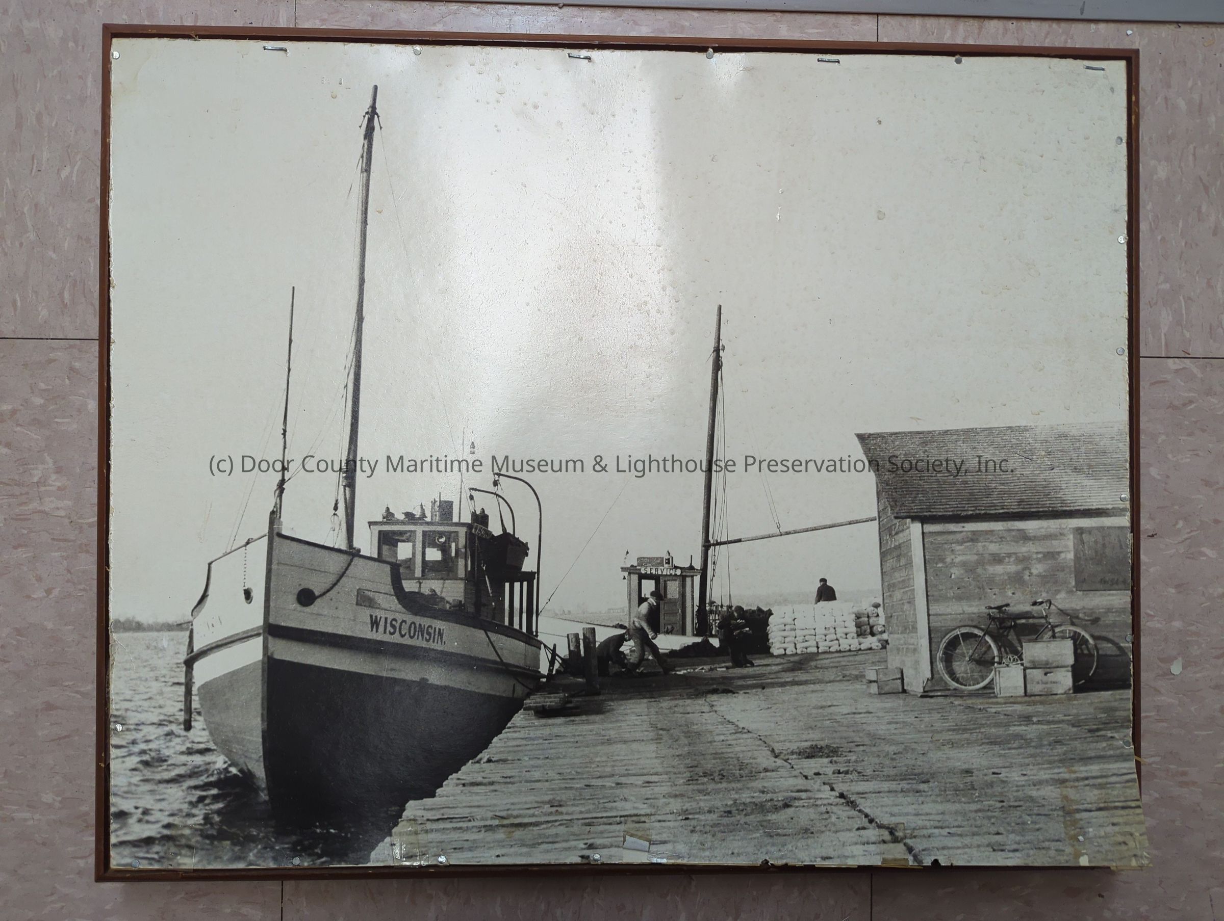 photograph of the vessel Wisconsin docked. Stapled to wooden frameLocation