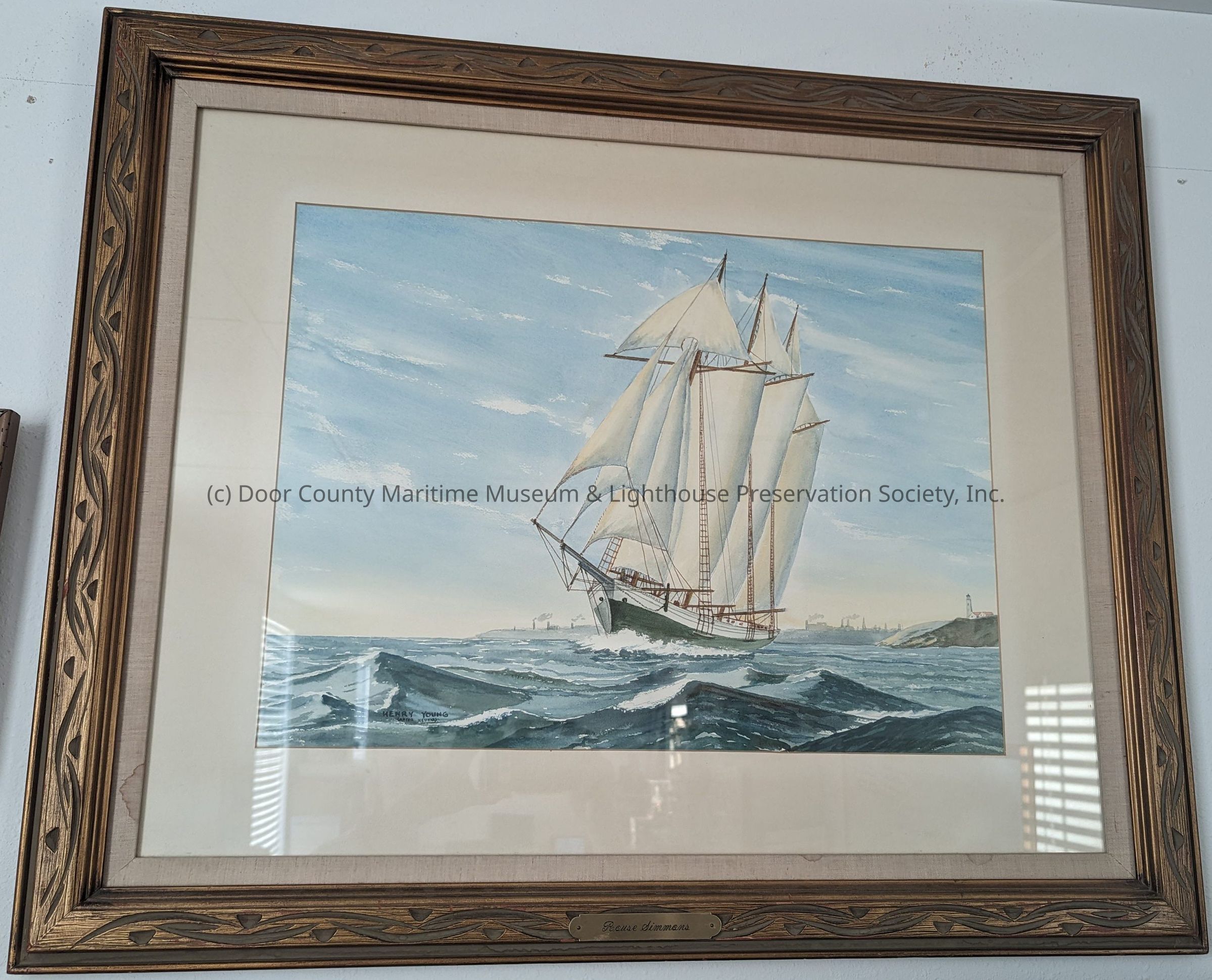 Framed watercolor painting of the Rouse Simmons underway. Lighthouse in the background