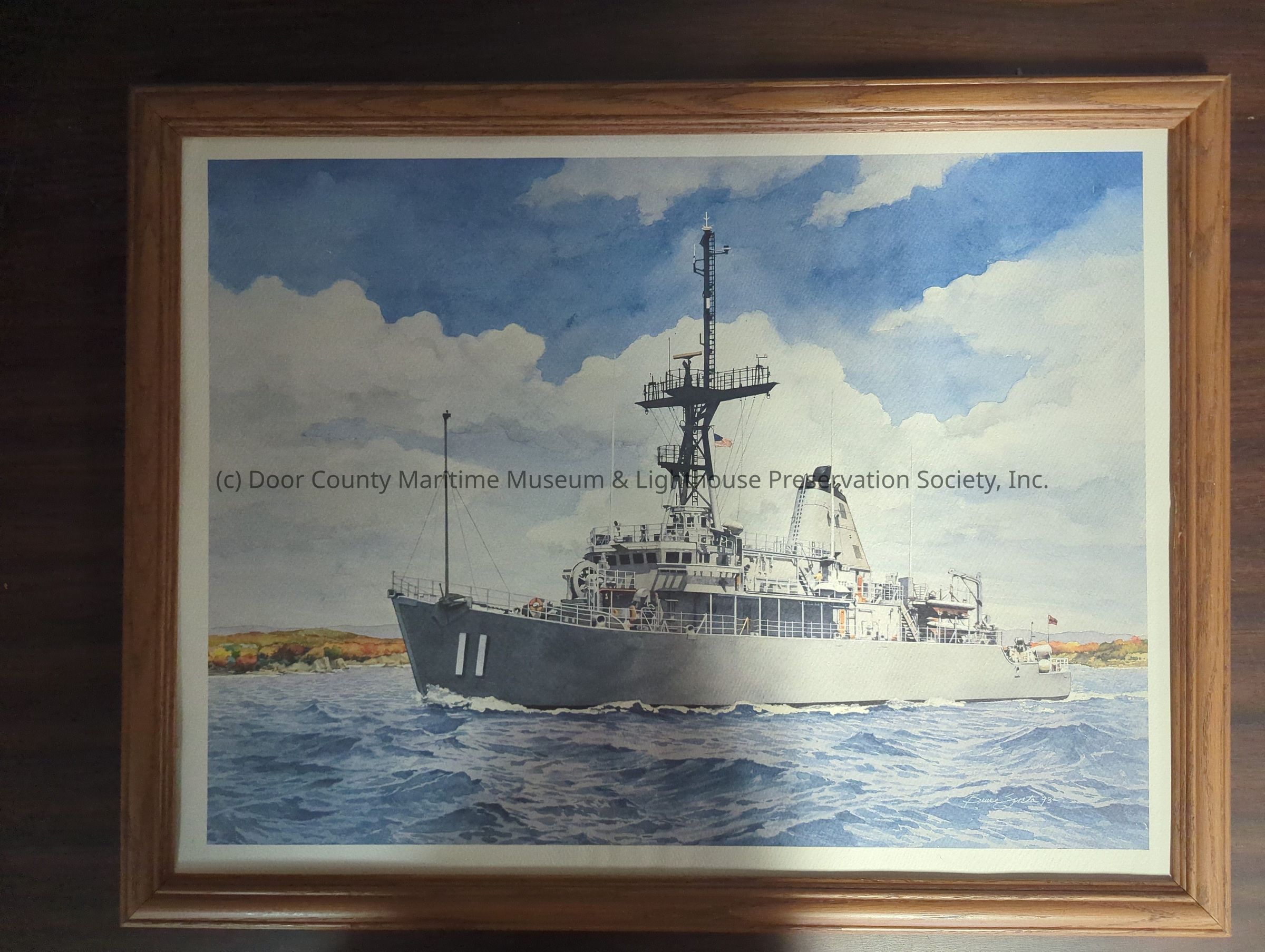Framed watercolor print of the vessel MCM-11 underway