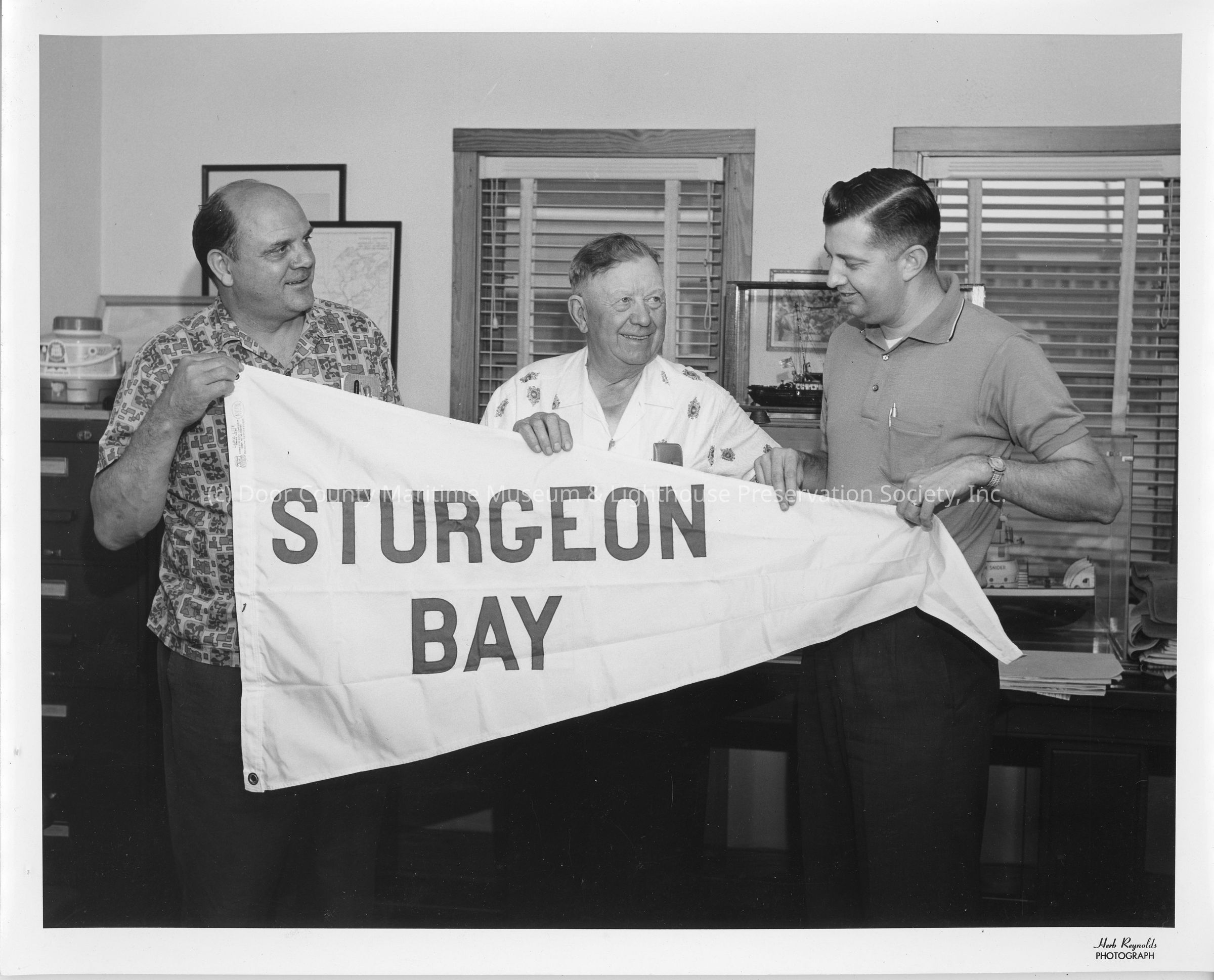 Frank Tachovsky, Captain John Roen, and Roland Berg holding burgee from Sturgeon BayEntry/Object ID