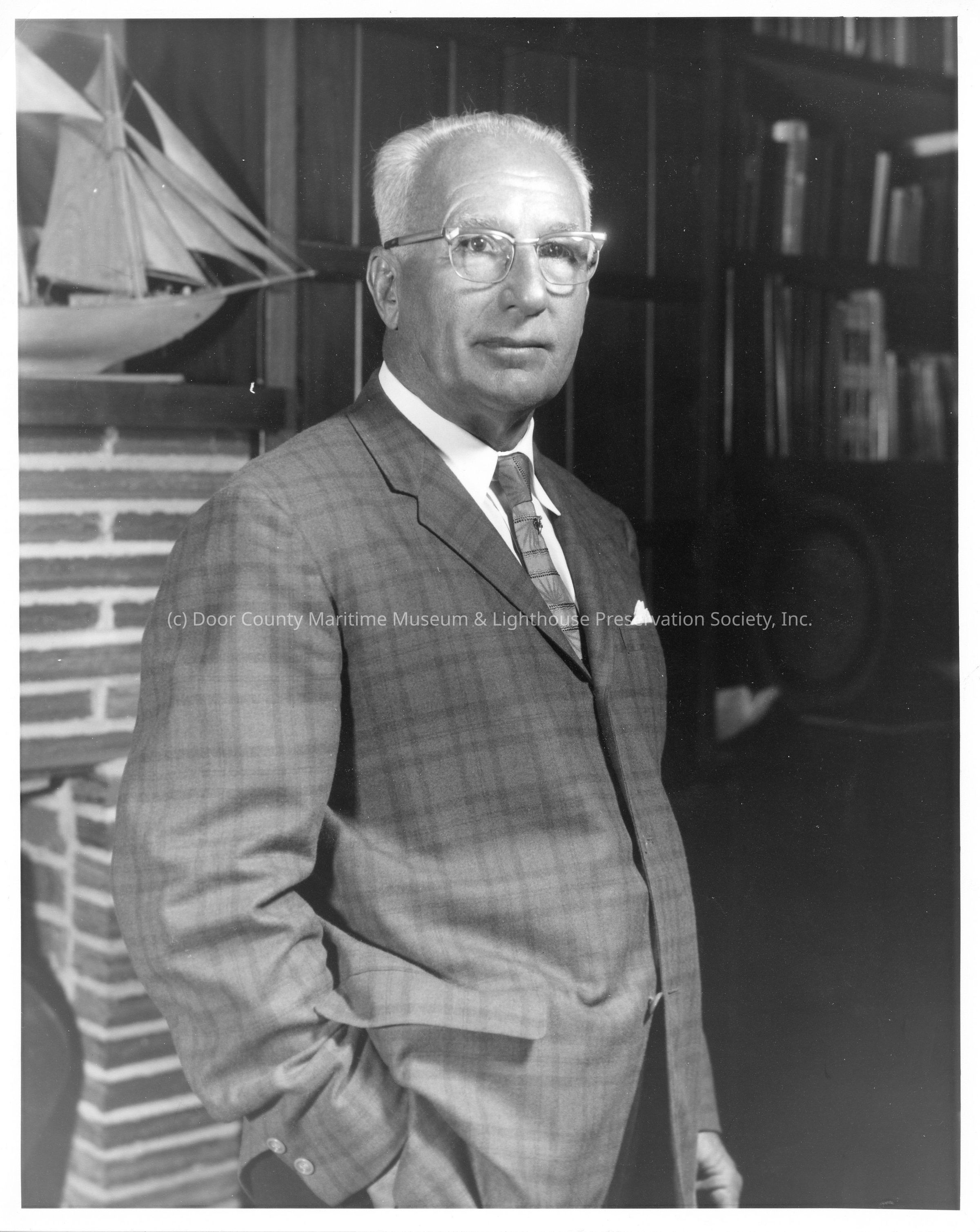 Fred Peterson in front of model sailboat