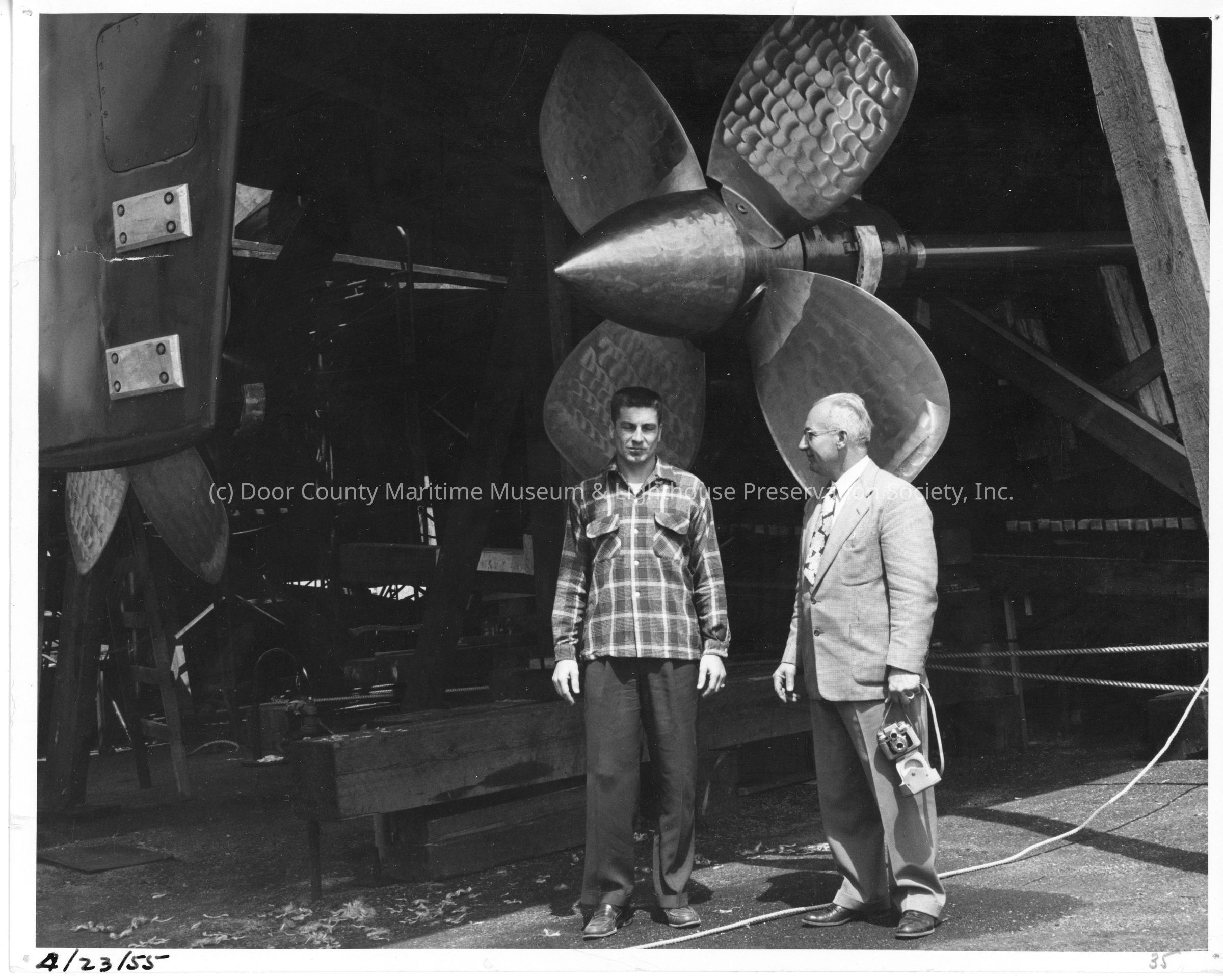 Fred Peterson with man and 4-blade propeller at Peterson Boat Works April 23, 1955Entry/Object ID