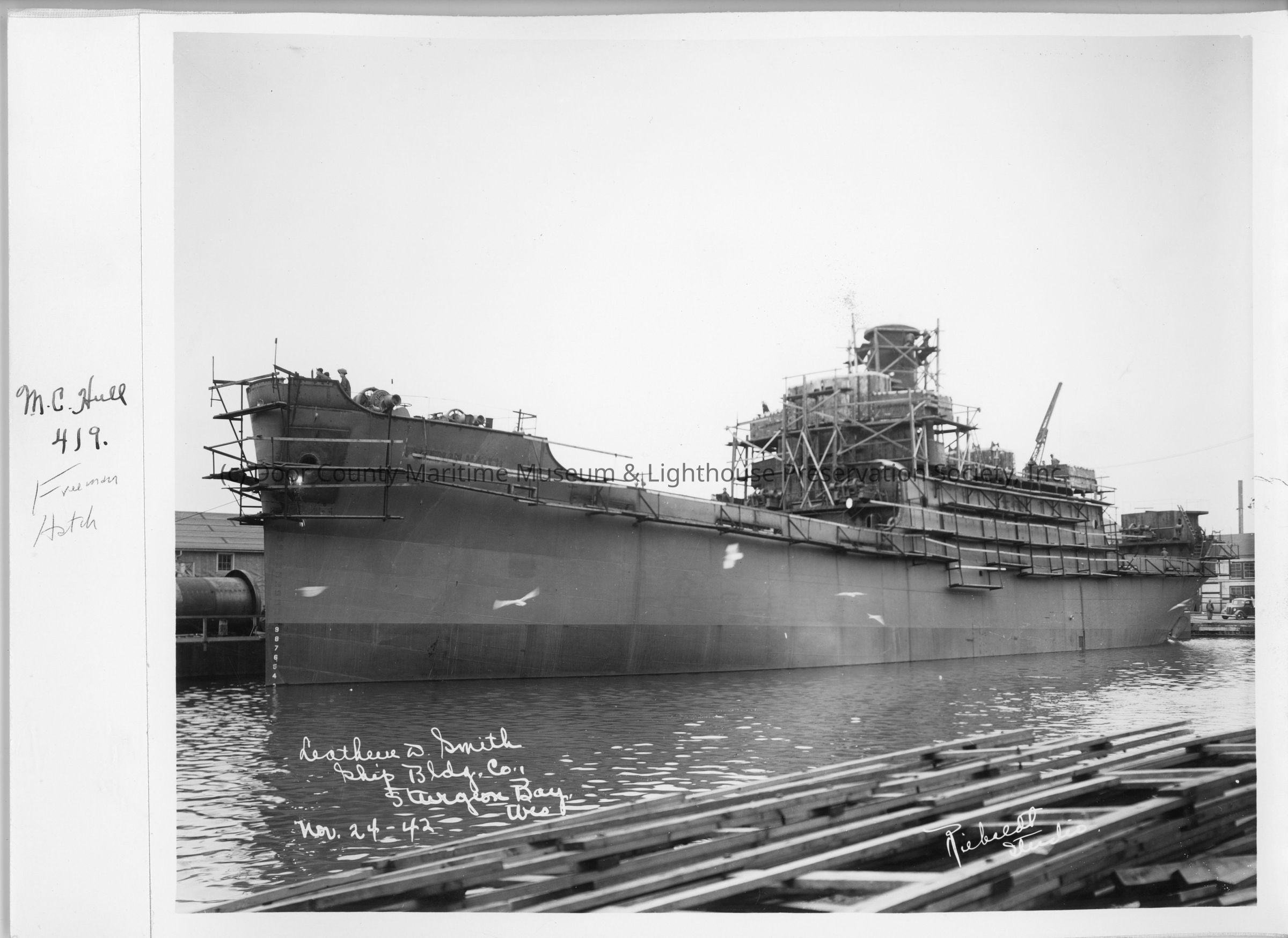 Colorless photograph of the M.C. Hull L/19 "freeman Hatch" dockside. Lumber in foreground. White writing on left side states, "Leathem D. Smith Shipbuilding Co. Sturgeon Bay, Wis November 24-42". White writing on right side of photo states, "Rieboldt Studio". The ship was built by Leathem D. Smith Shipbuilding Company. launched on 9/7/1942Location