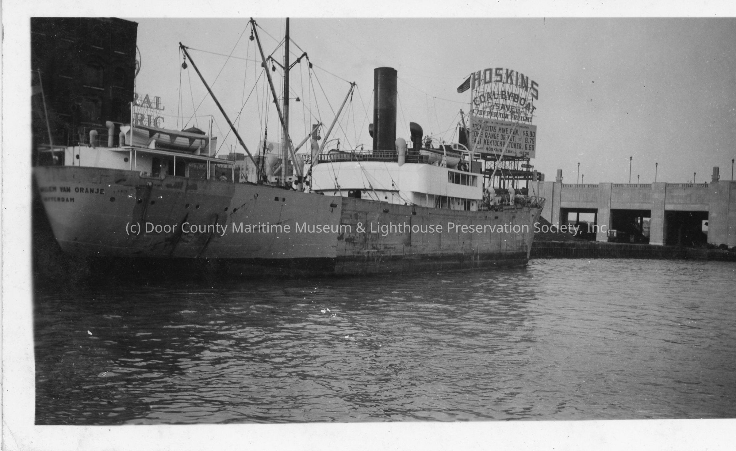 Freighter Van Oranje docked next to Hoskins coal by boat sign