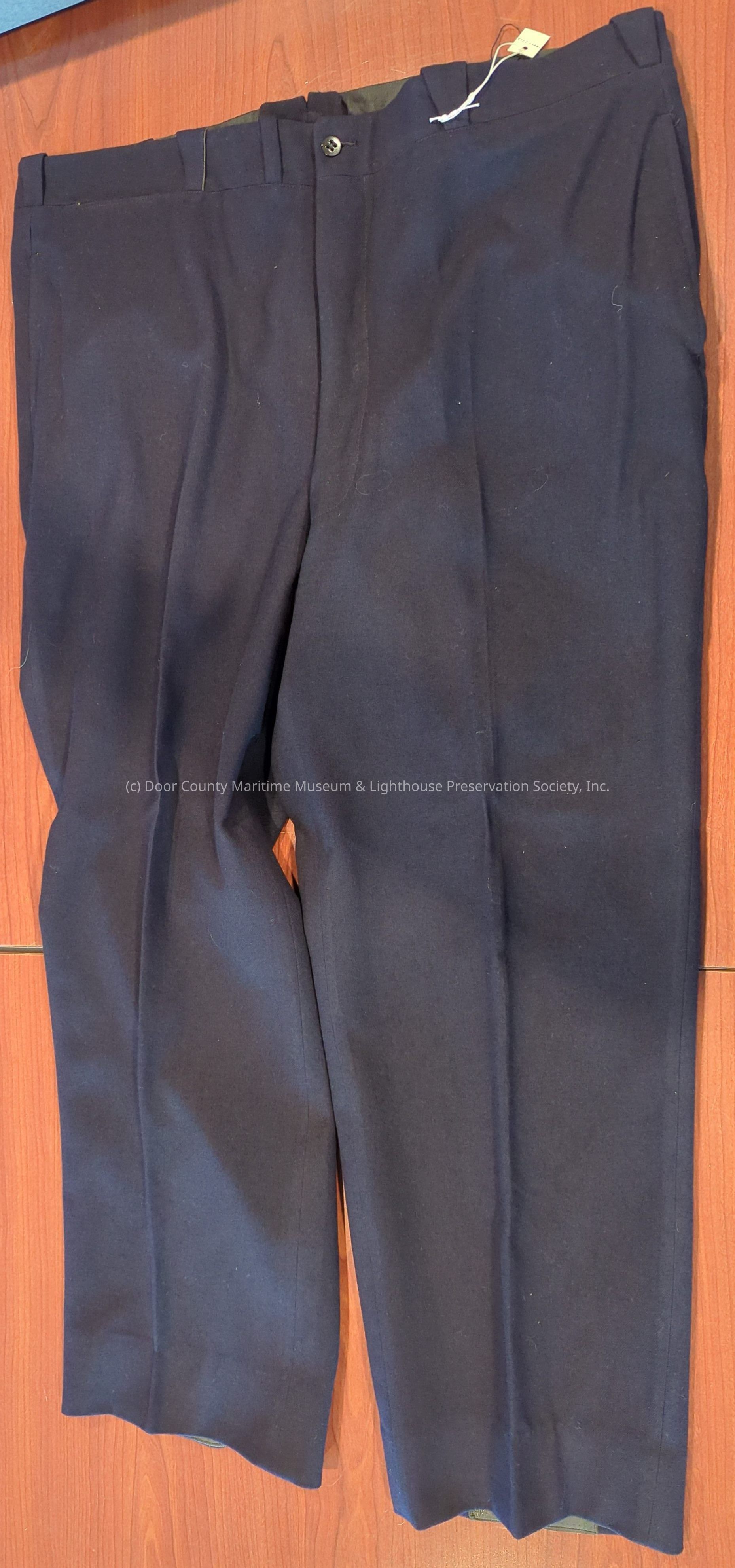Uniform pants (Interlake Steamship Co.): overall color navy blue; white pocket material shows on the interior; 2 back pockets, button-down; additionally, 2 front slash pockets and separate watch pocket at waist (right side).Location