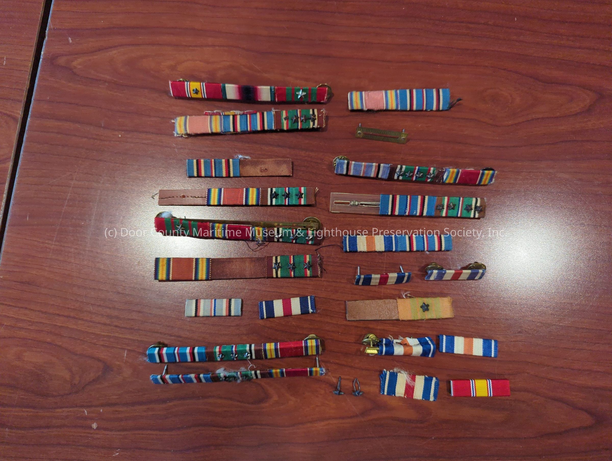Collection of 21 - pins, military - stripes: no overall color; each ribbon is a combination of colored stripes; each grouping of stripes having a particular meaning; some ribbons may also have dimensional stars; some are separated from backing; ranging from 1 3/8" to 4" long; 1/2" wide.Location