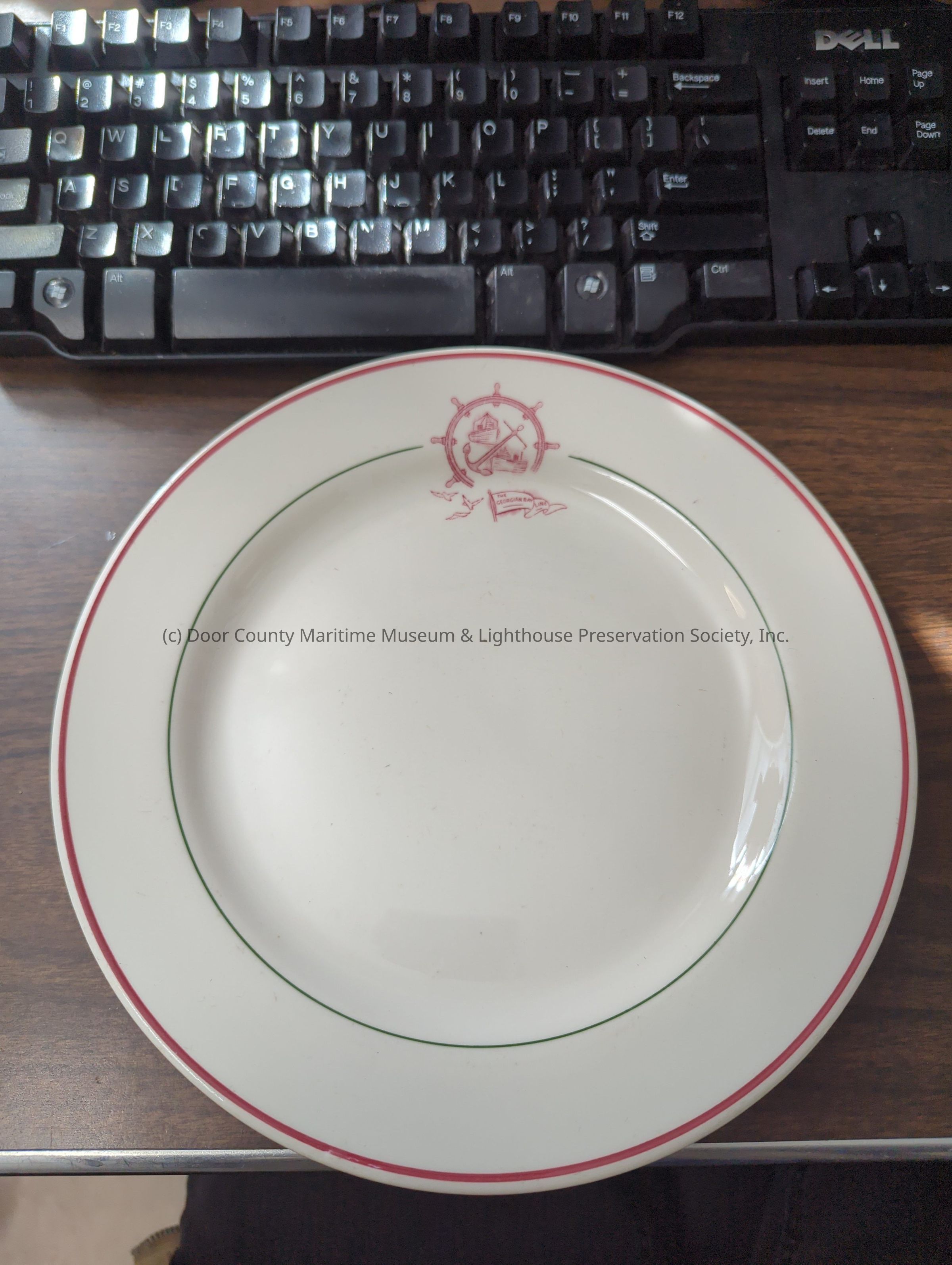 White porcelain with red trim. Inner circle is green. Georgian Bay flag and logo in red