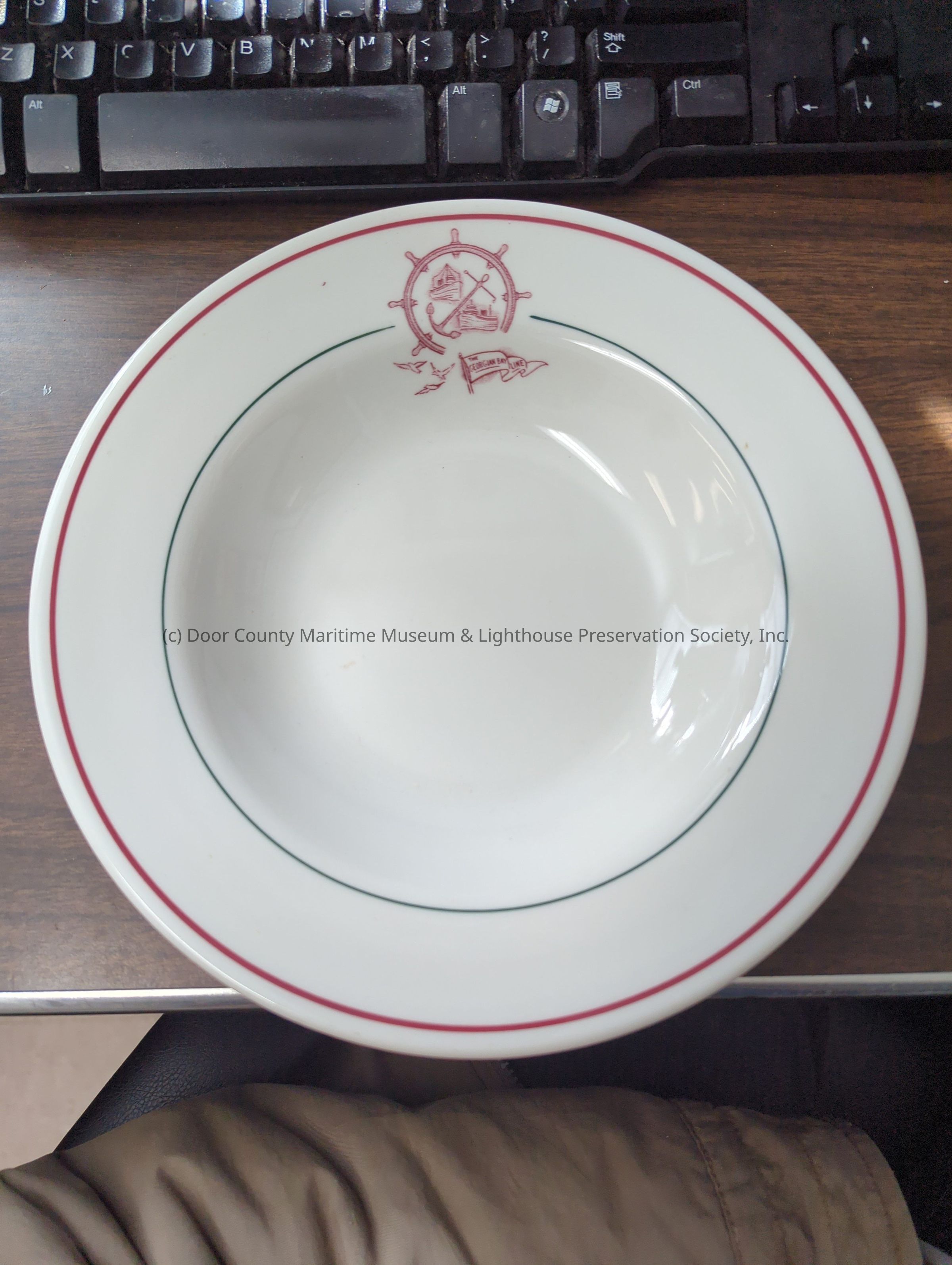 White porcelain with red trim and green inner circle. Georgian Bay flag with red logo