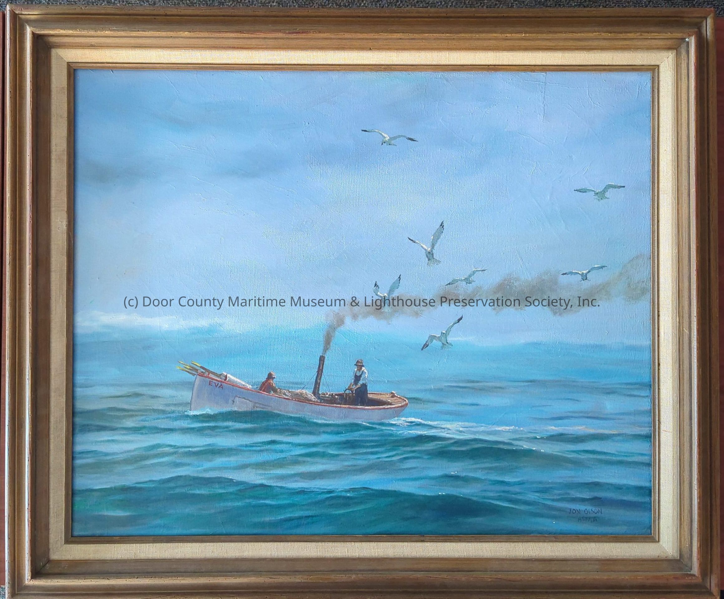 Oil Painting in golden frame. Depicts two anglers on a fishing boat with the engine billowing smoke. Seagull fly next to the boatLocation