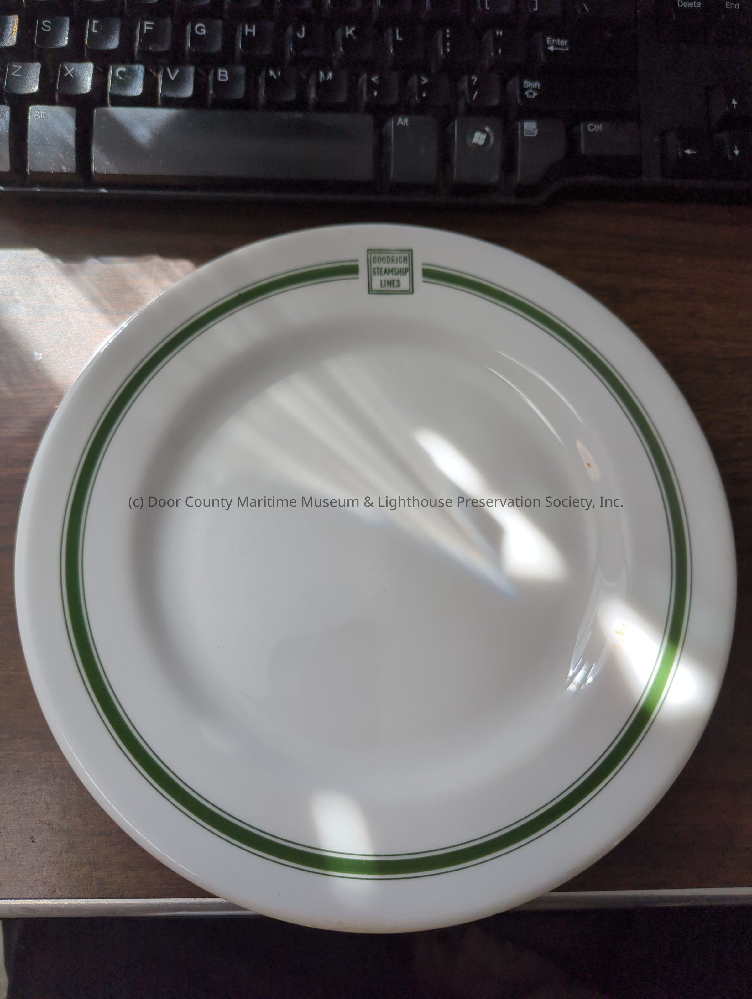 White porcelain with green trim around circumference. One wide green line surrounded on both sides by narrow green lines. "Goodrich Steamship Line" in greenLocation