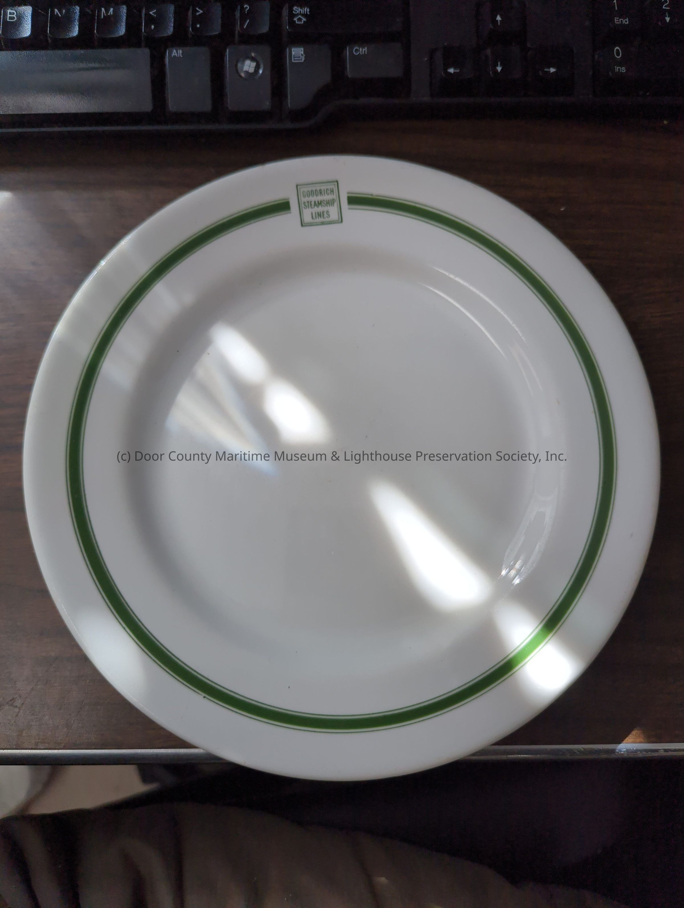 White porcelain dinner plate with green trim around circumference. One wide green line surrounded on both sides by narrow green lines. "Goodrich Steamship Lines" in green.Location