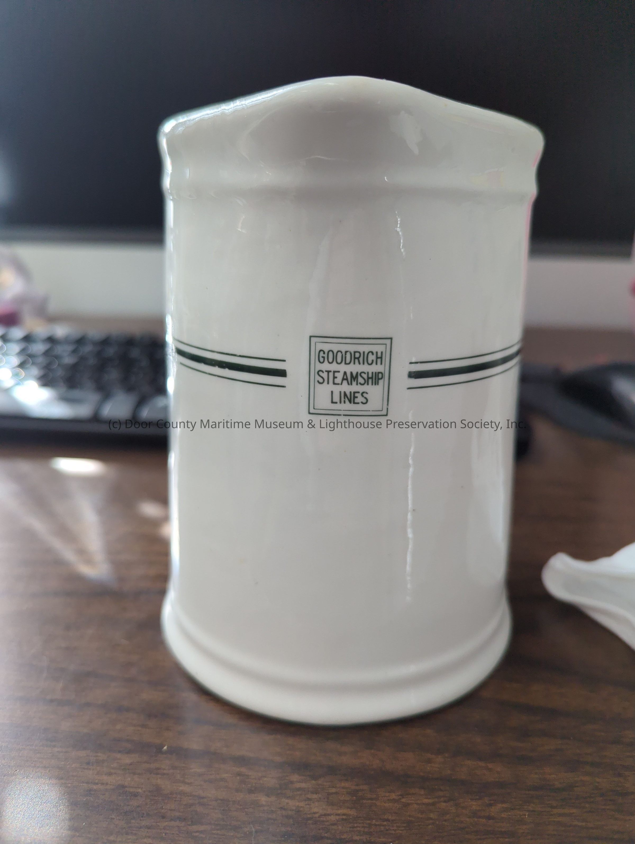 White porcelain pitcher with three green lines around circumference. Narrow green lines surround one thick green line. Chip on bottom. "Goodrich Steamship Line".Location