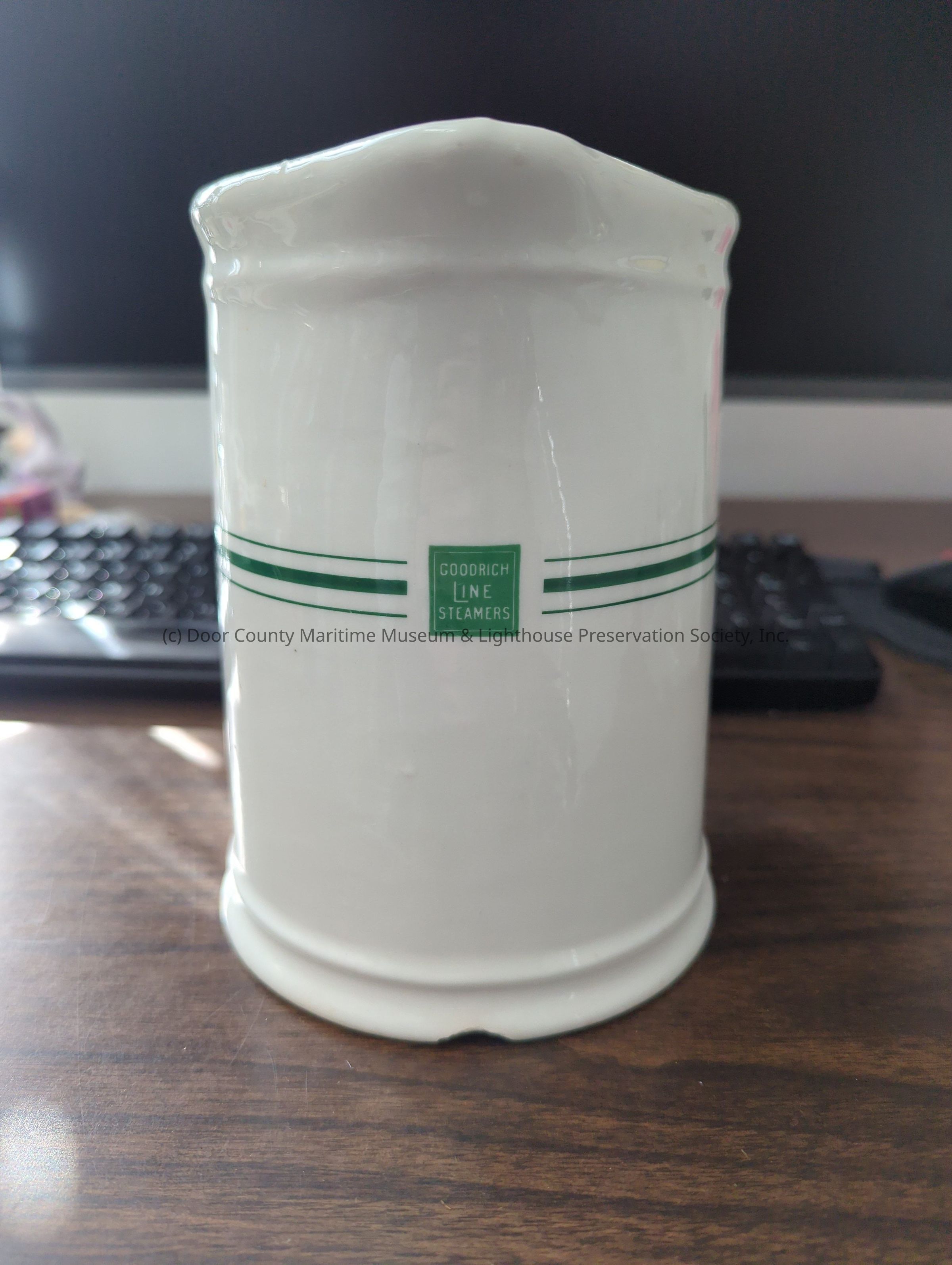 White porcelain pitcher with three green line around circumference. Narrow green lines surrounding thick green line. "Goodrich Steamship Line". Chip on bottomLocation