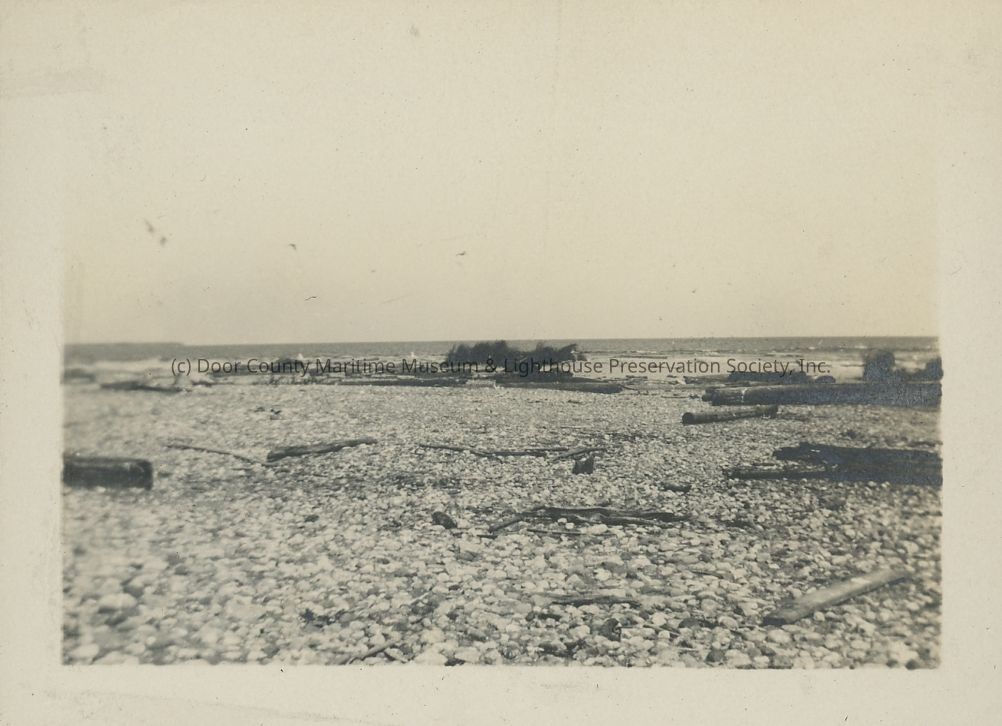 Unidentified gravel shoreline with driftwood washed ashore, described as gravel island.