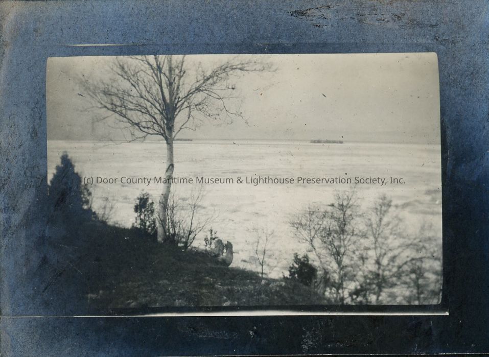 Elevated view of Green Bay shoreline with ice in the bay. Near Eagle Light.