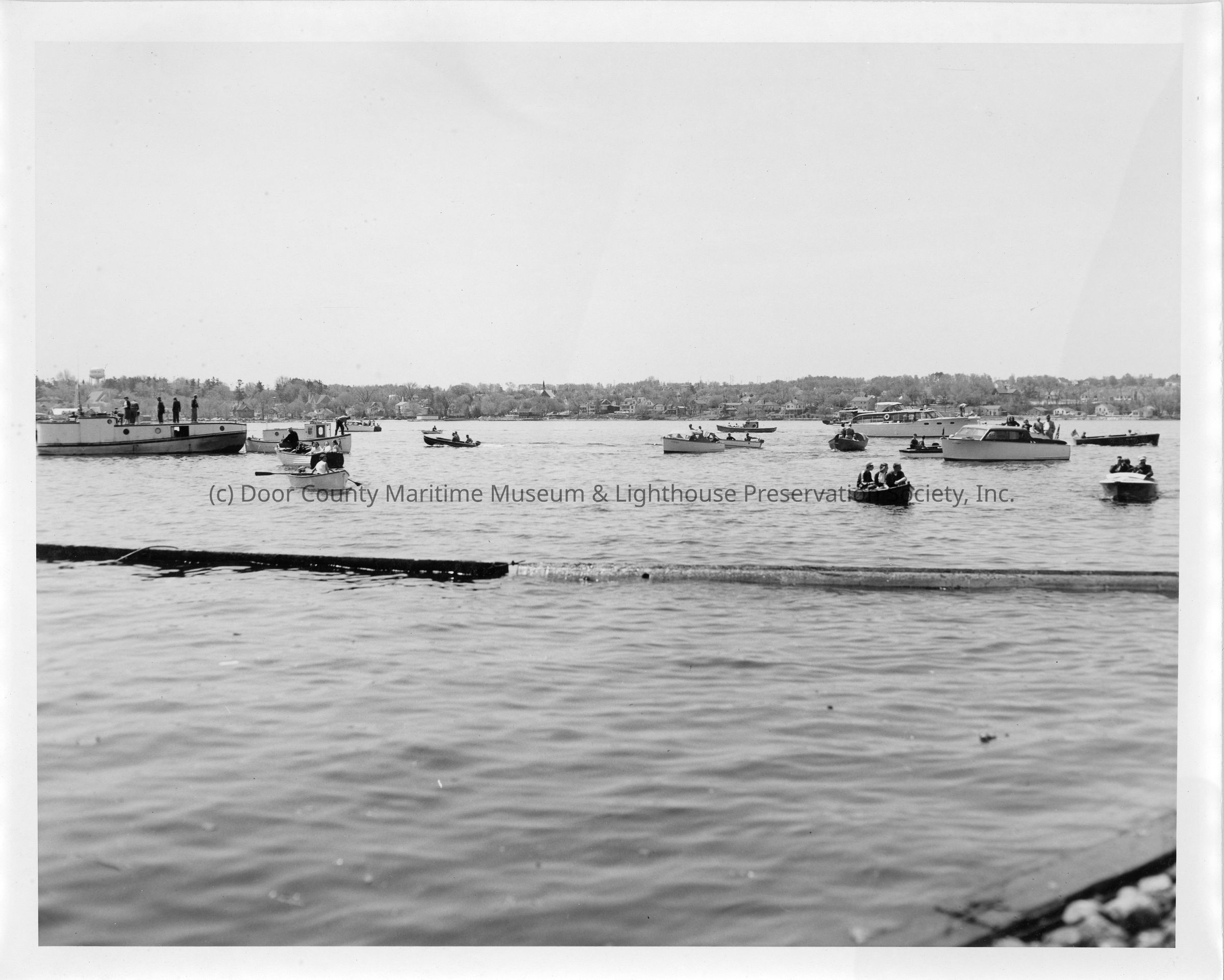 Group of boat in water during launching of LST-1170, May 22, 1954