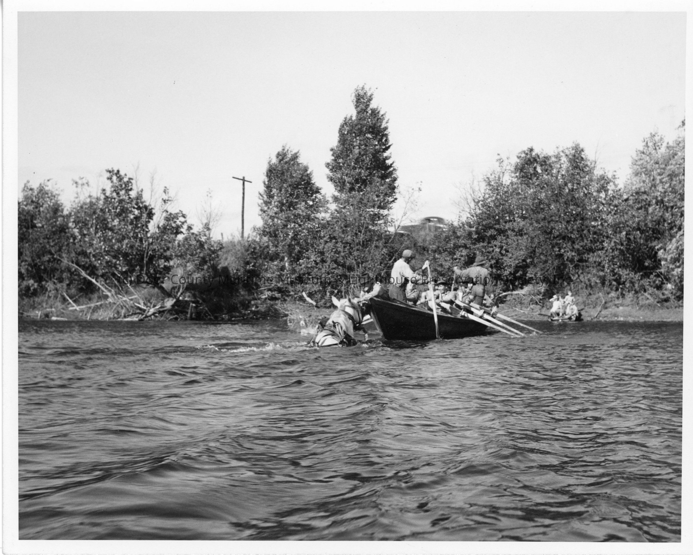 Group of men in a rowboat with a horse in the river mississagi drive August 1944