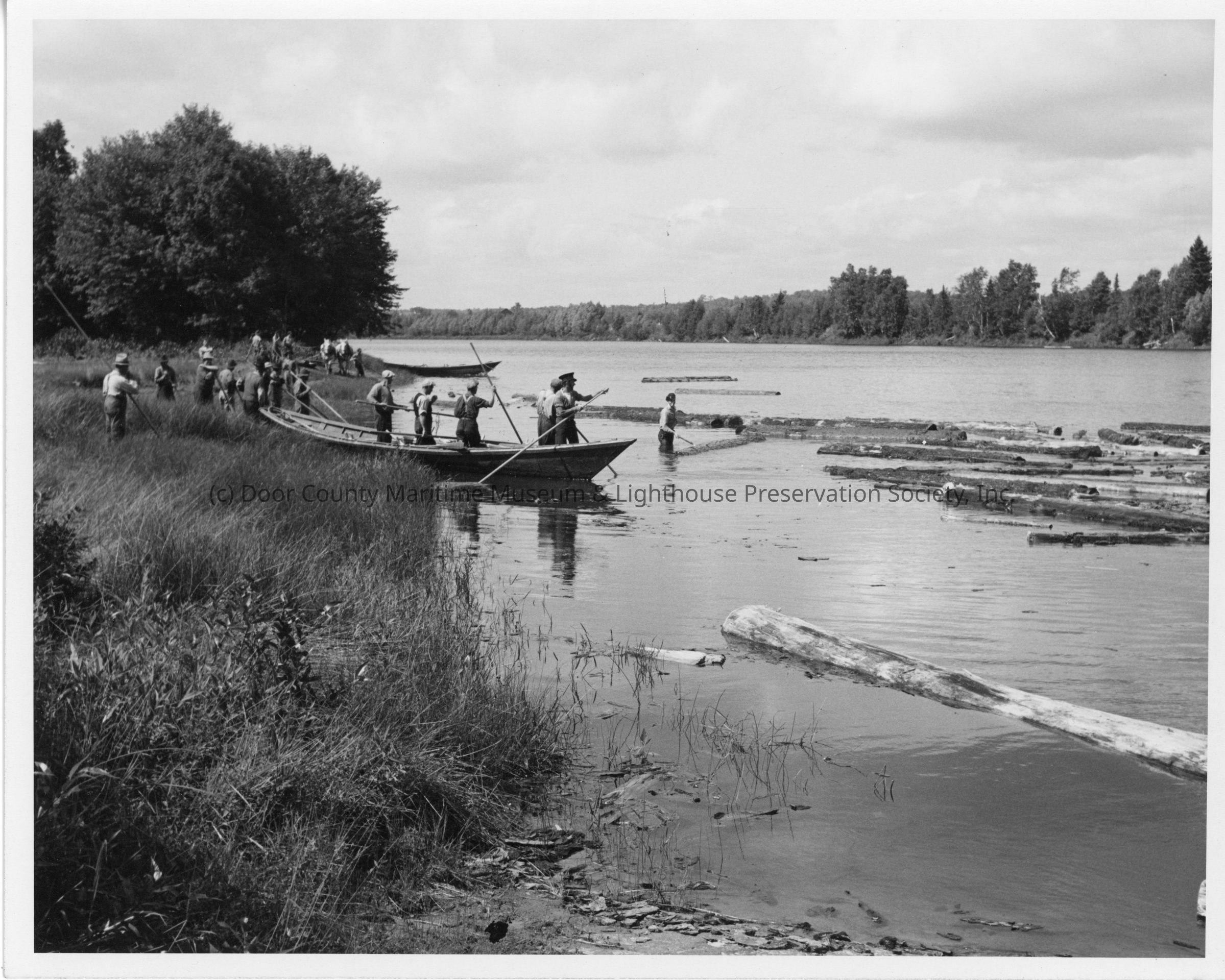 Group of men in a rowboat with logs in a river mississagi drive August 1944
