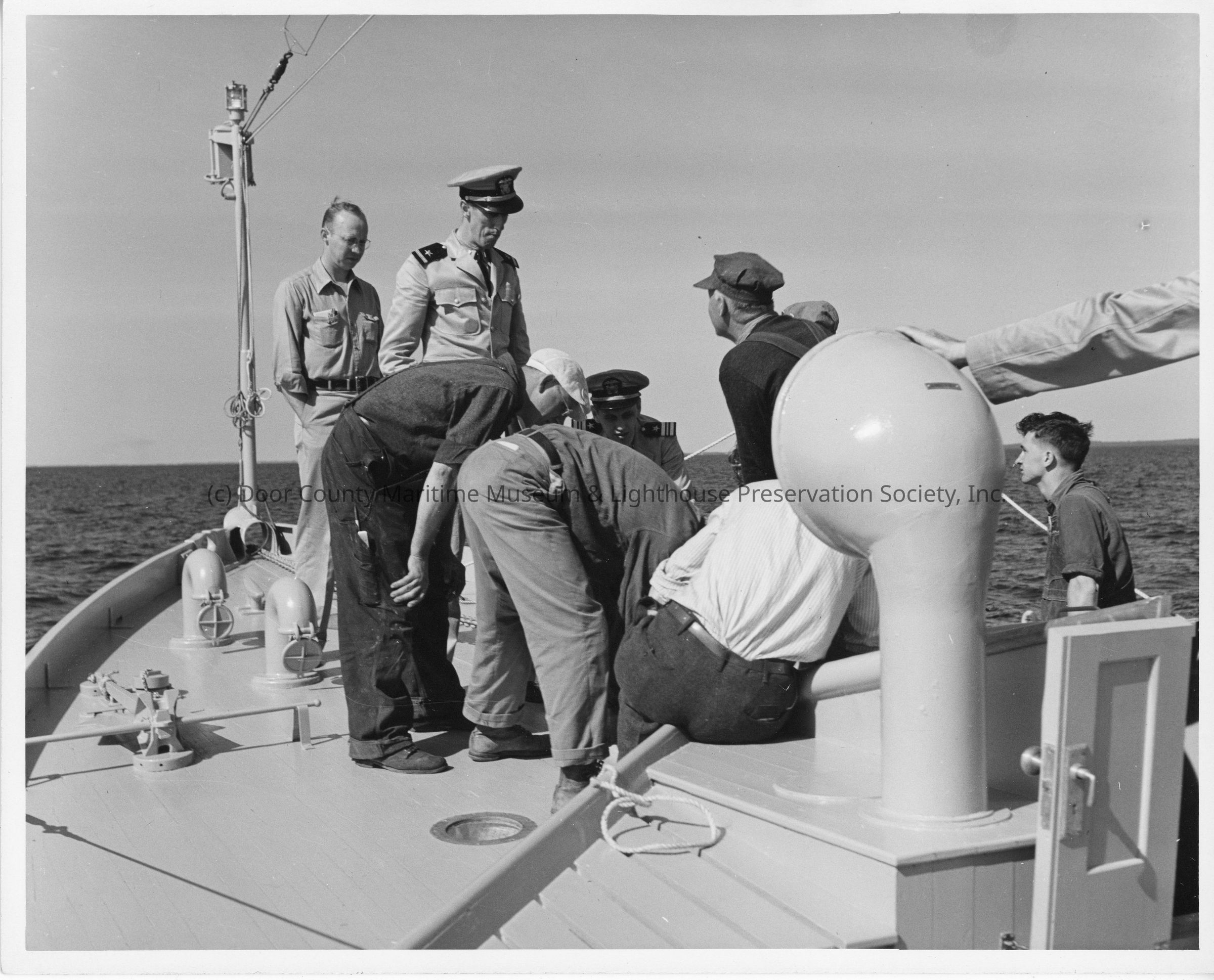 Group of men on bow of SC-643 during trial run August 5, 1942