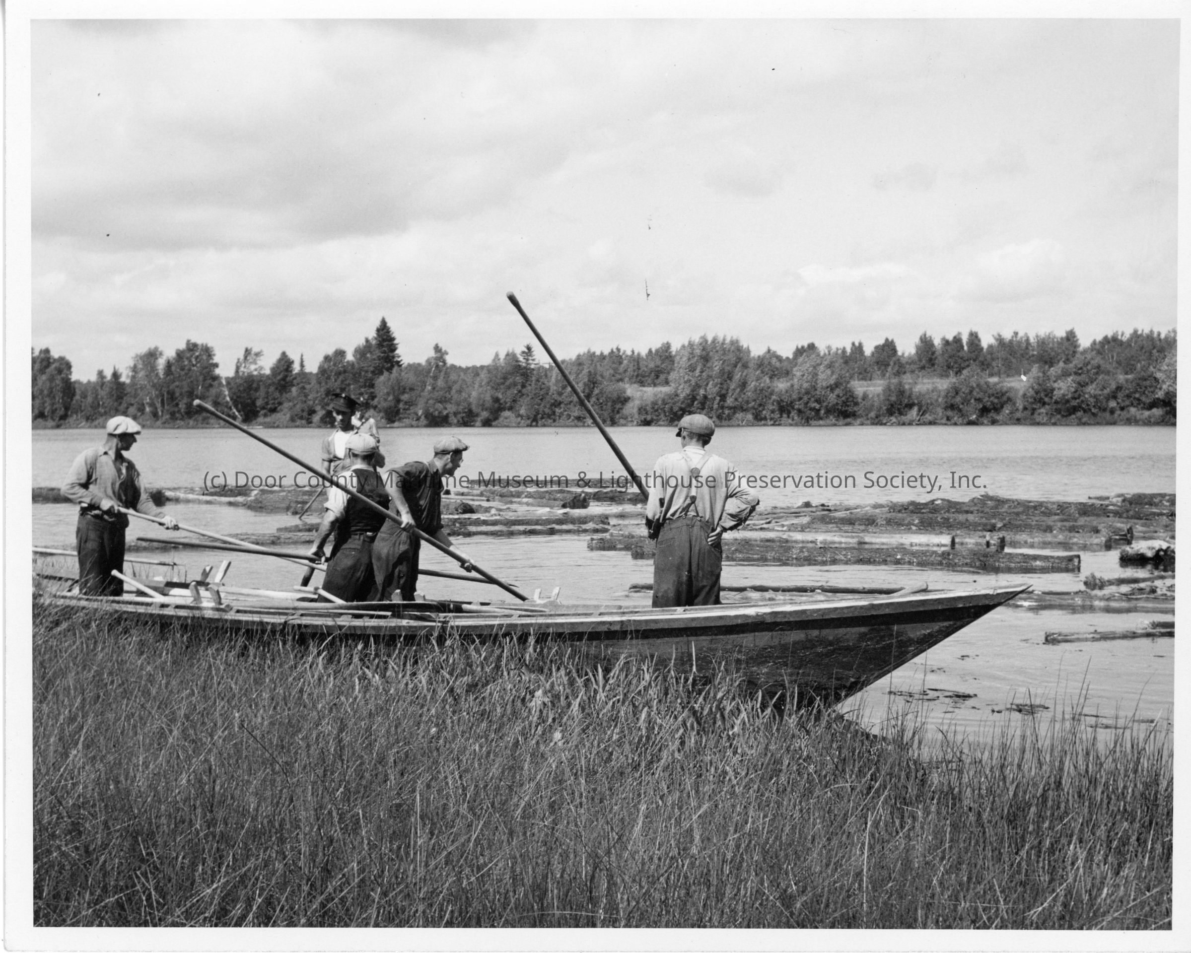 Group of men on shore next to rowboat during mississagi drive August 1944
