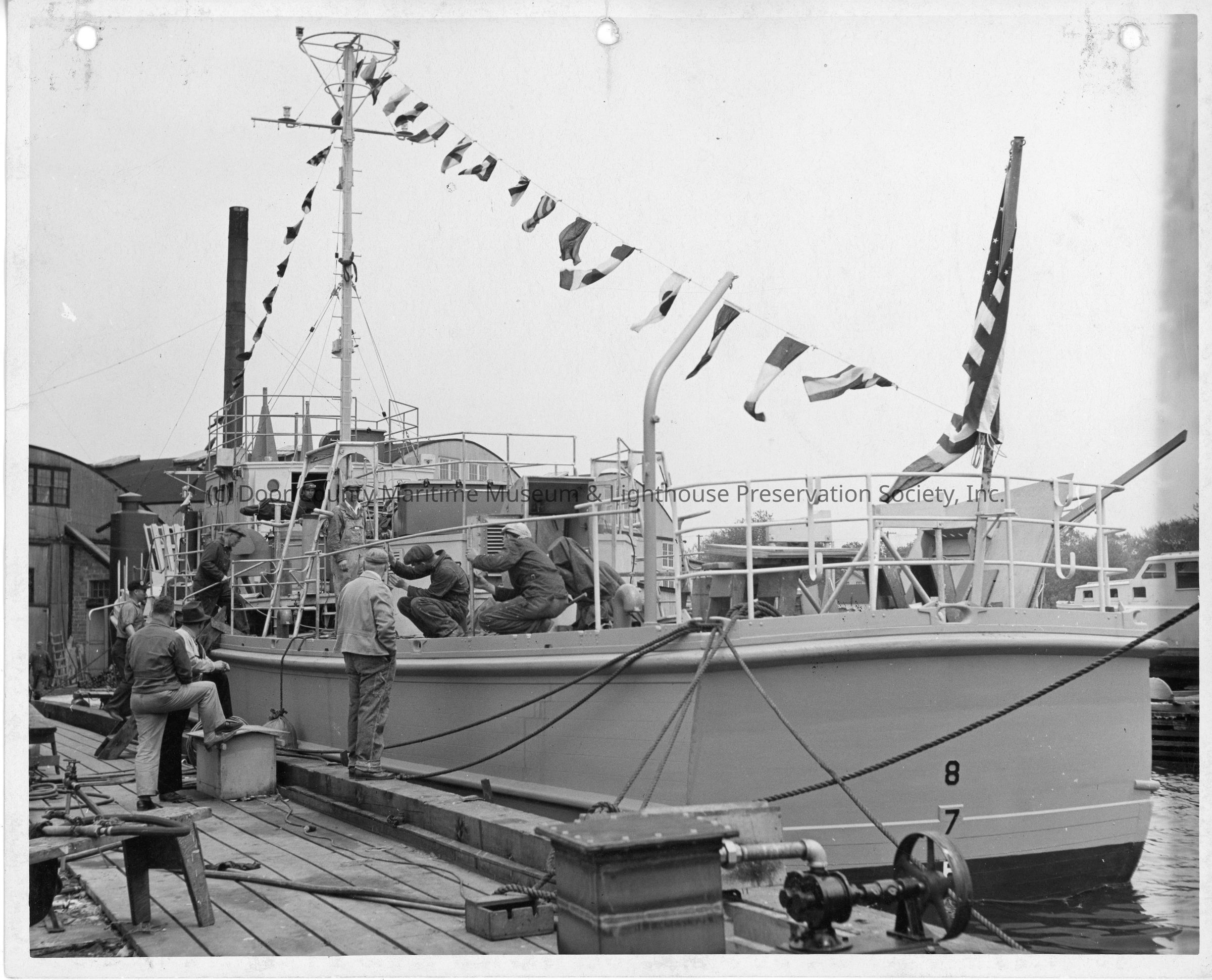 Group of men on vessel docked at Peterson Boat Works May 29, 1943