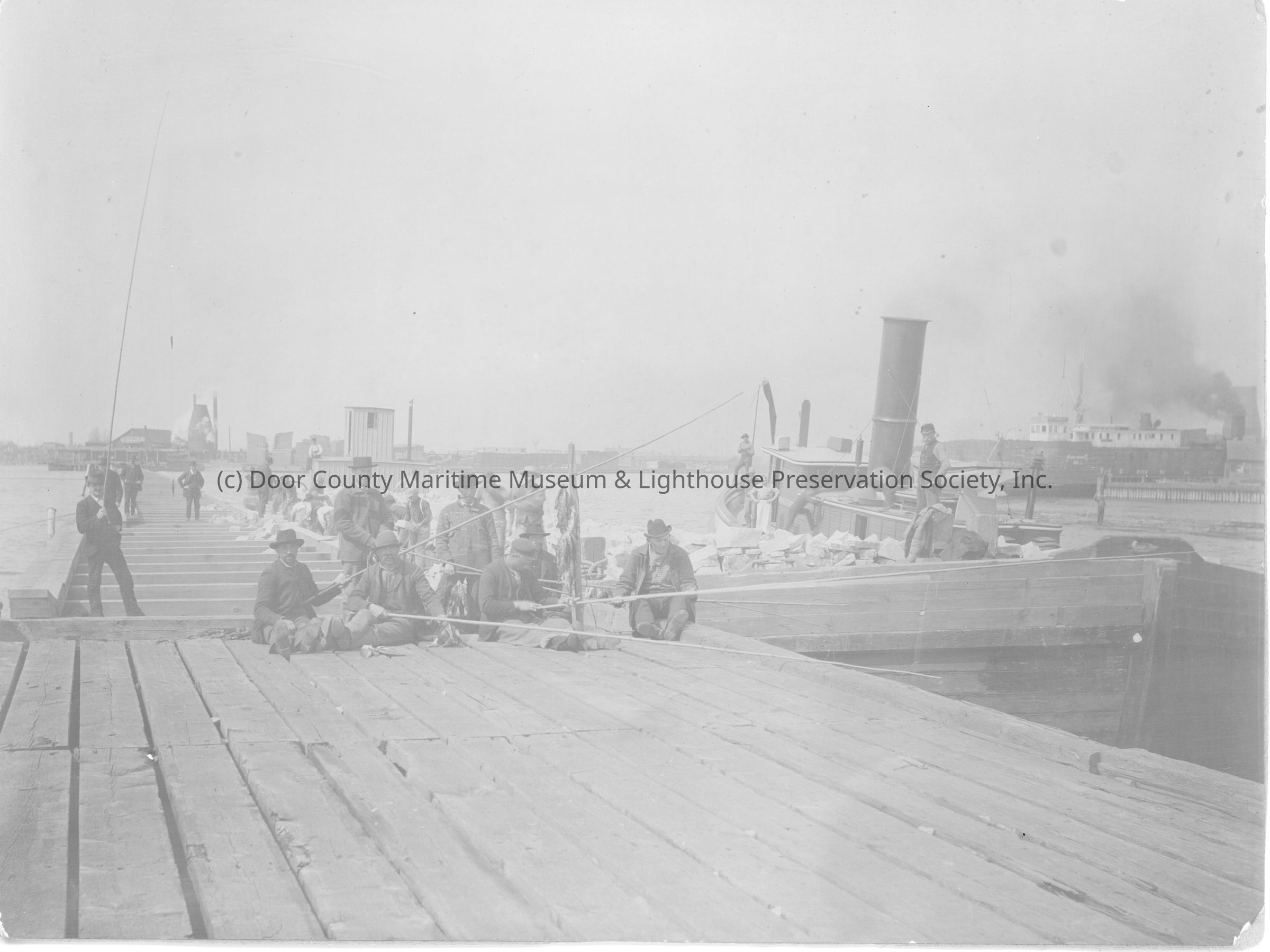 Group of men sitting on deck holding poles