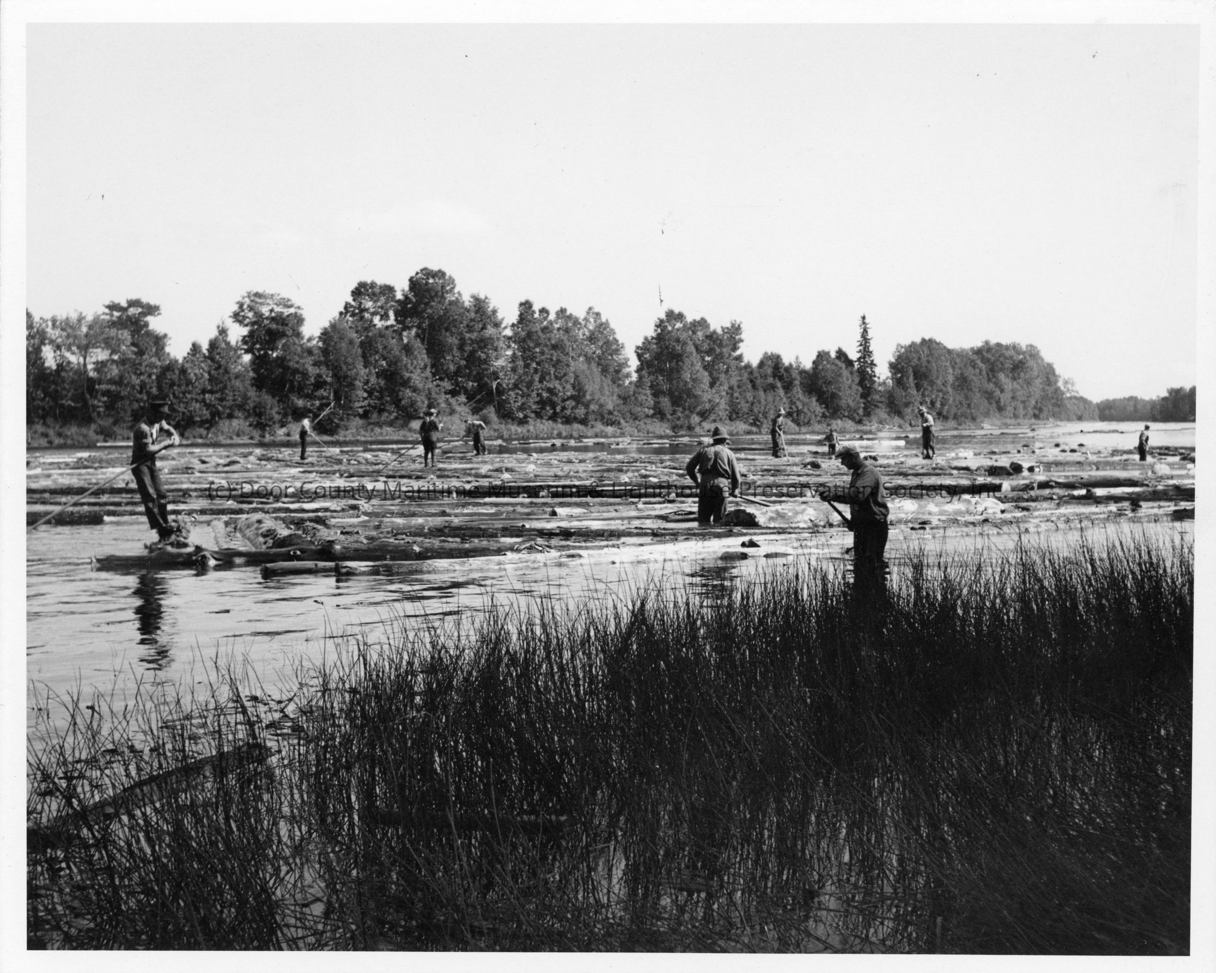 Group of men standing on a pile of logs in a river mississagi drive August 1944