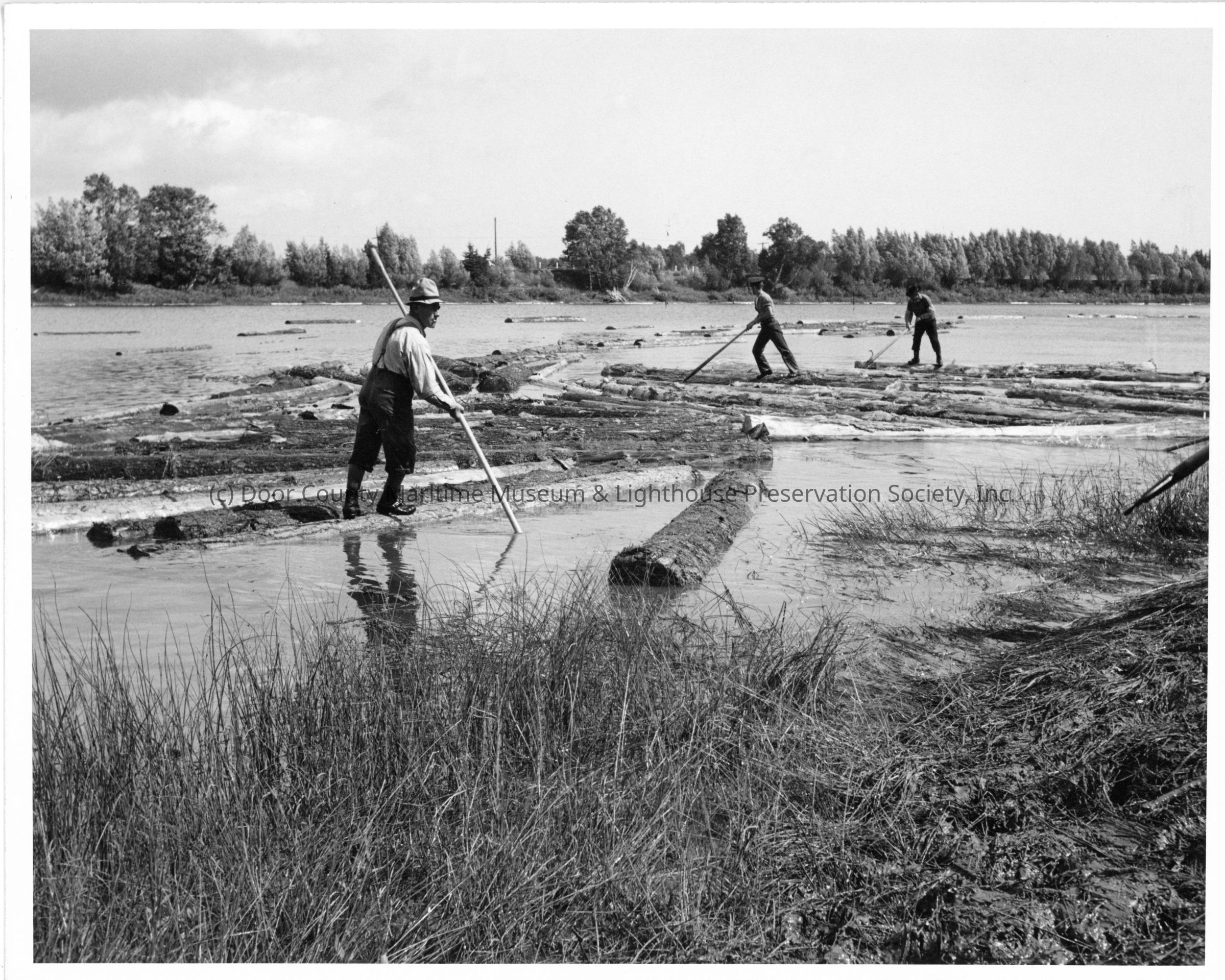 Group of men standing on a pile of logs in a river mississagi drive August 1944