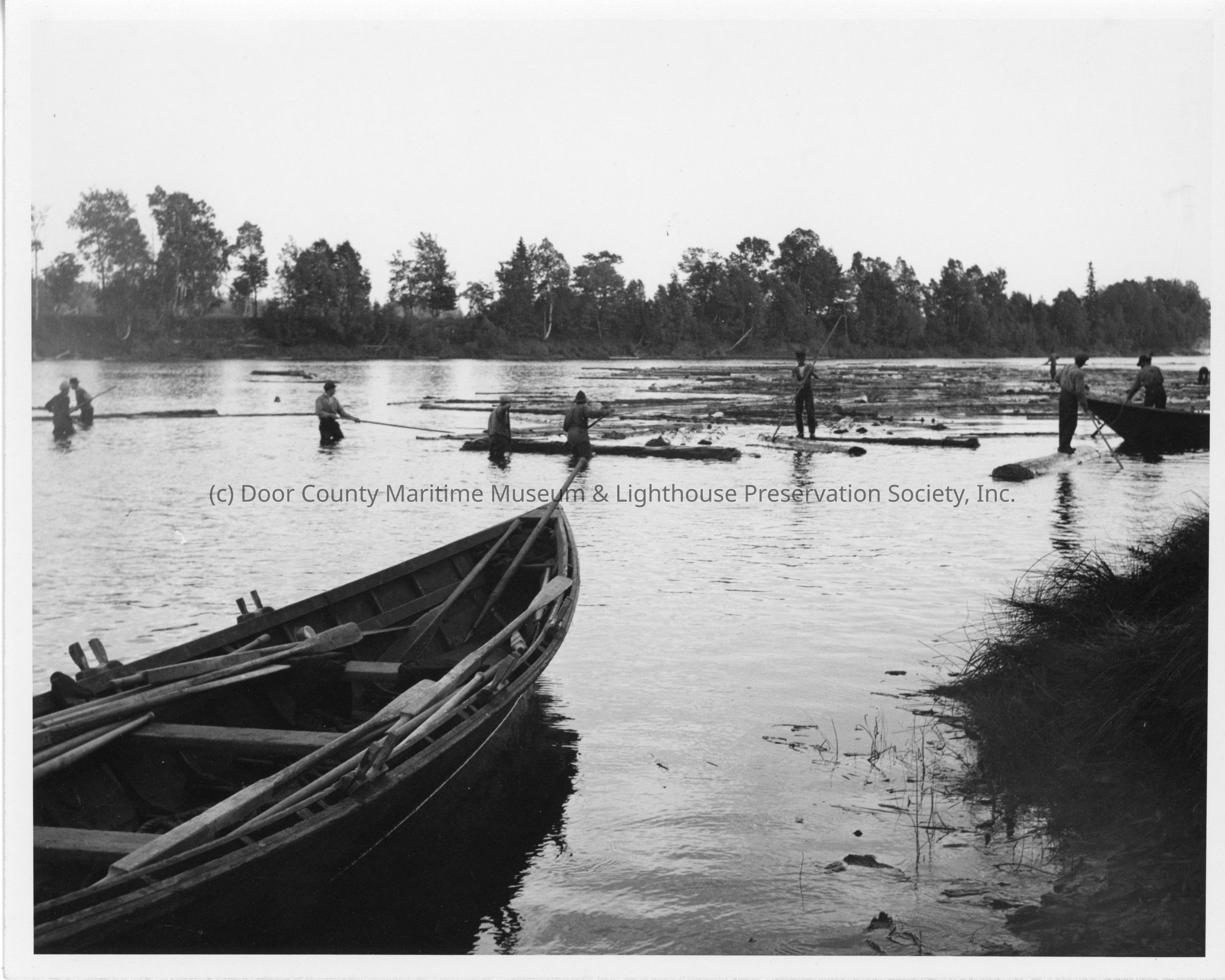 Group of men standing on a pile of logs in a river with a rowboat in the foreground mississagi drive August 1944