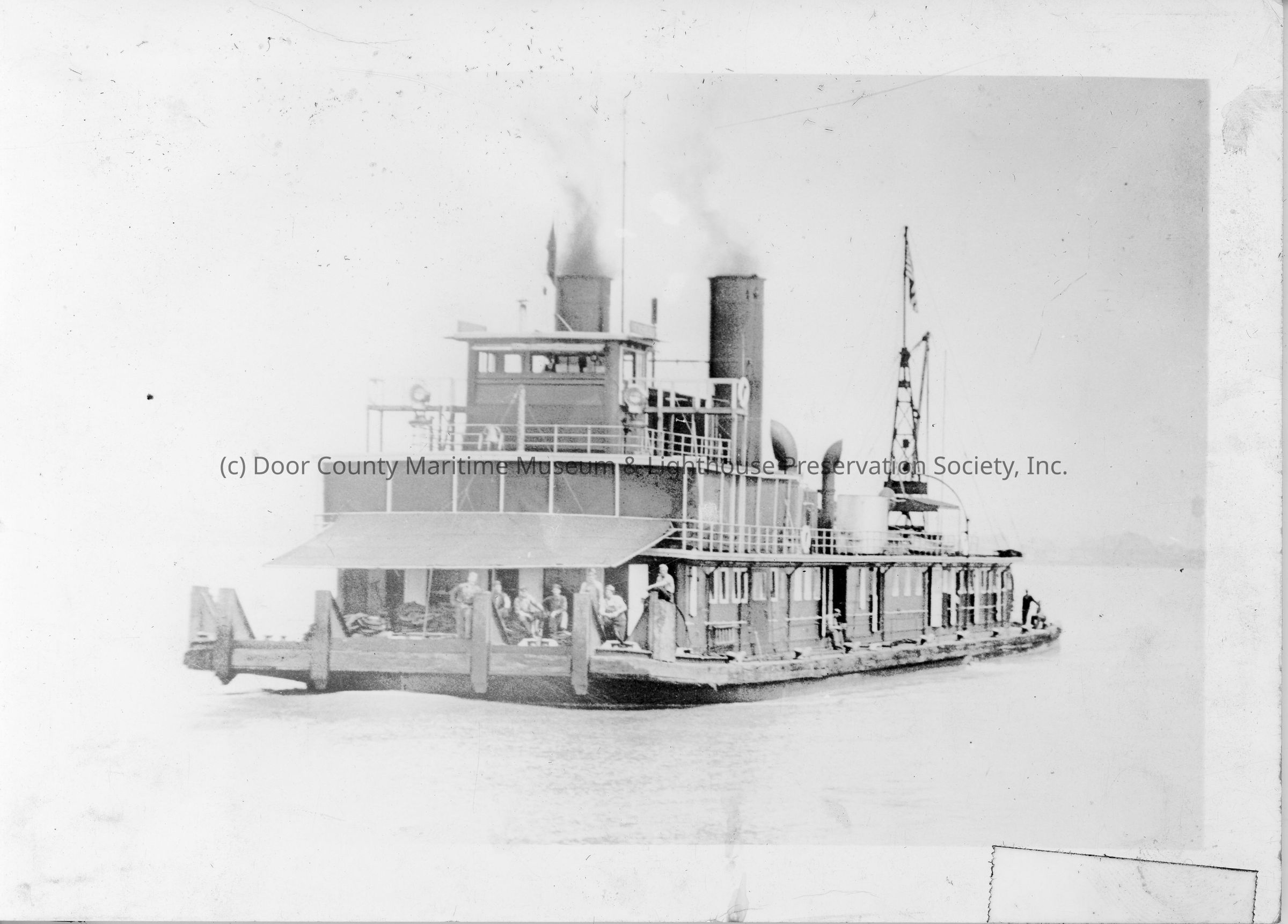 Group of men standing on bow of barge underway