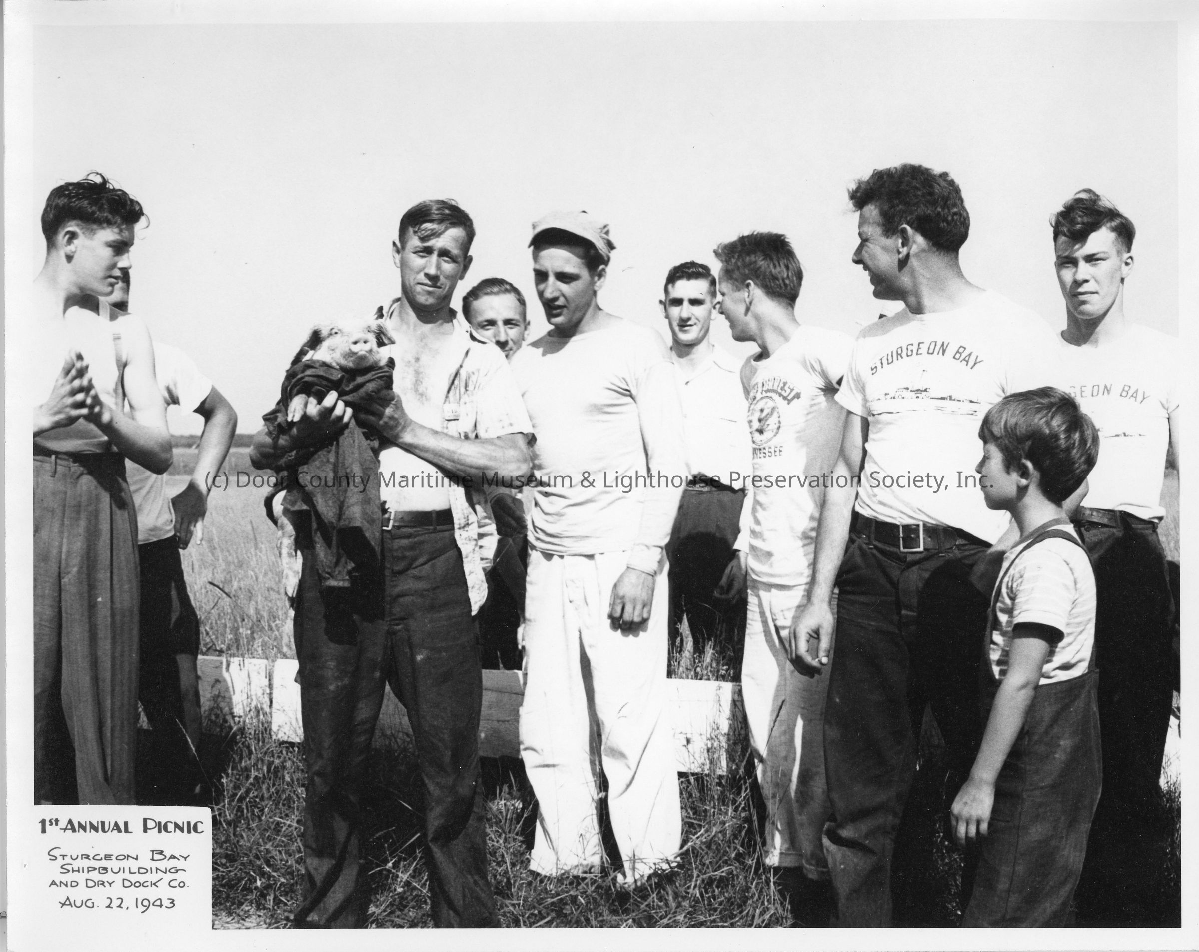 Group of men with one holding a pig at SBSB&DD Co. 1st annual picnic August 22, 1943Entry/Object ID