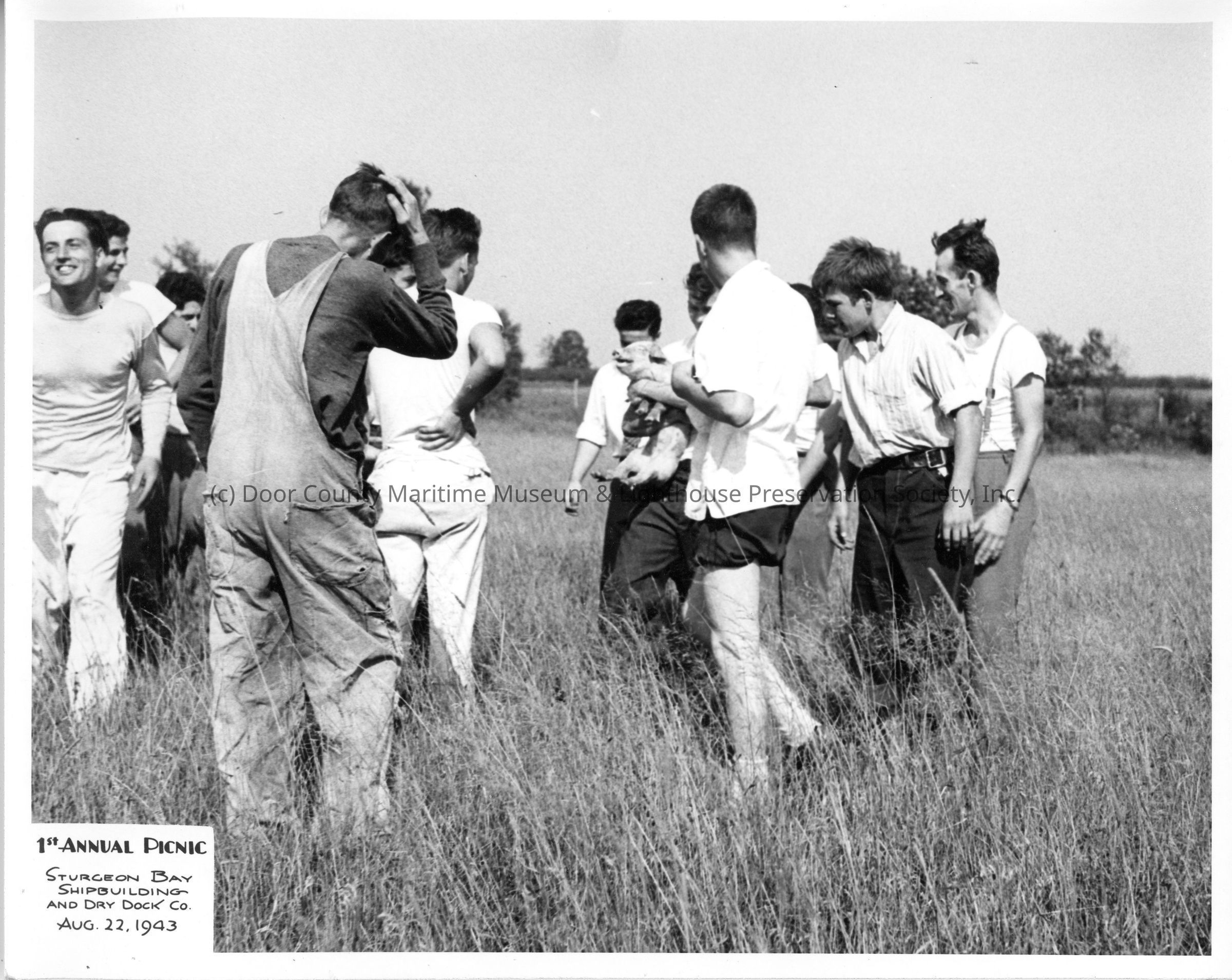 Group of men with one holding a pig at SBSB&DD Co. 1st annual picnic August 22, 1943Entry/Object ID