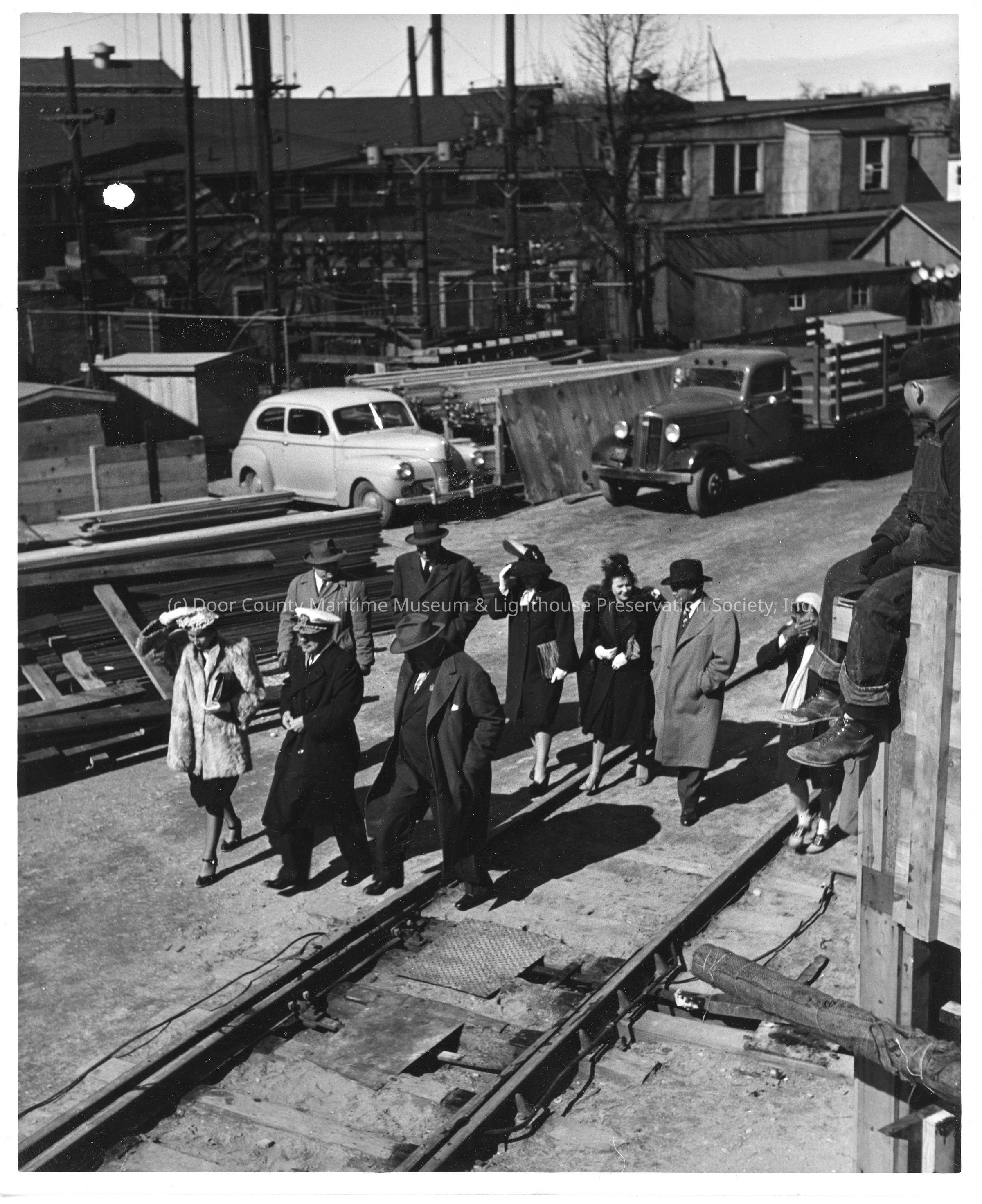 Group of nine walking on train tracks
