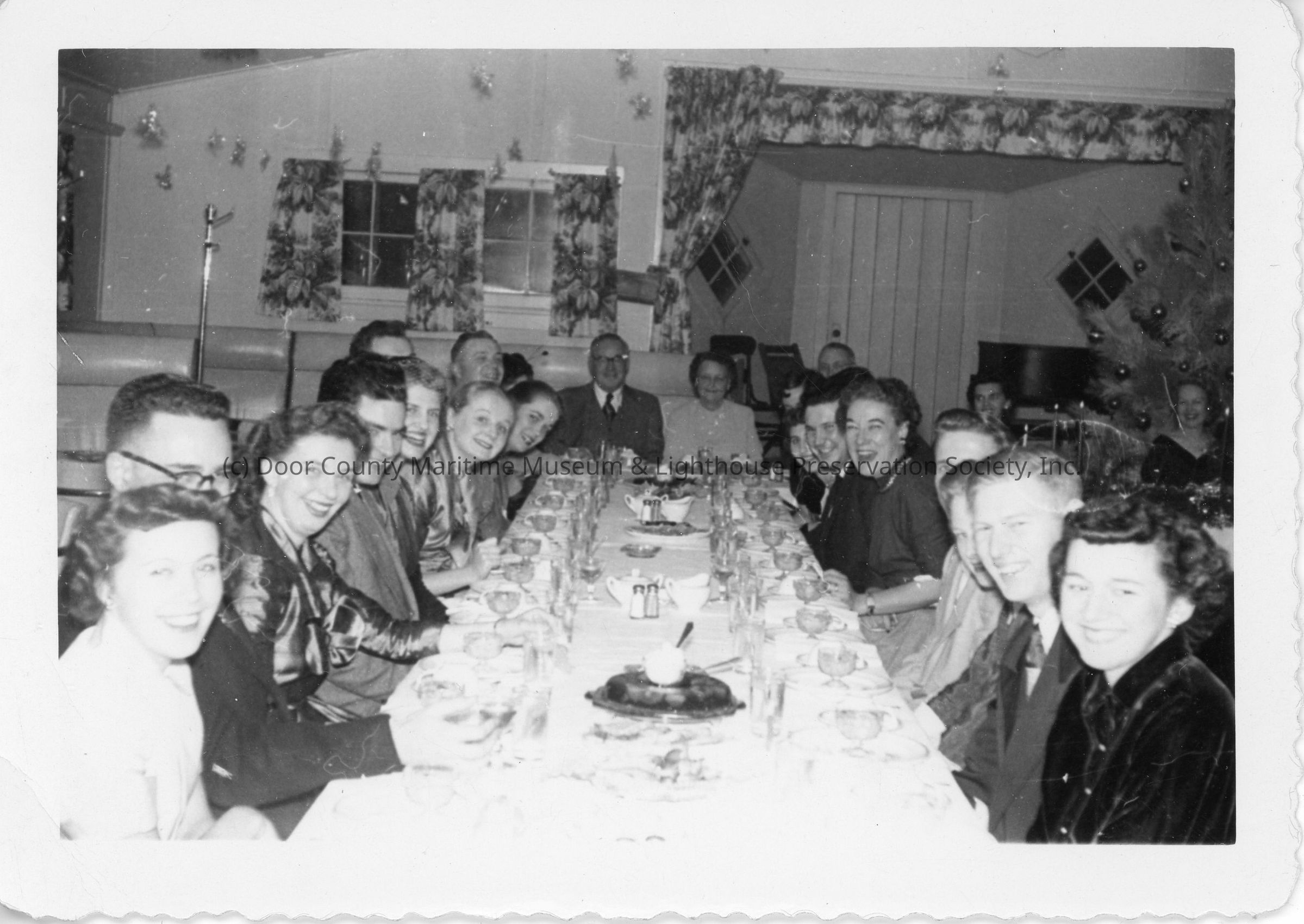 Colorless photograph of Navy Office Party. Delore Wilke, Clyde Stephenson, Kate Simon, Beverly Krueger, Bob Krueger, Renie Ling, Art Anderson, Andy Ganiskim Ruth Ganiski, William Mac Mahon, Mrs. Mac Mahon, Mrs. Joe Brizinsky, Joe Brizinsky, Nina Schumacher, bob Evenson, Gwen Washburn, Sonia, Joe Davidoffm Shiela, Eddie, Nadia DavidoffLocation