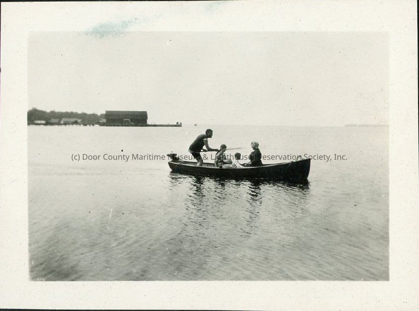 A man in swimwear, two children and a woman on the Hotz family outboard motorboat they called the Evinrude. Summer 1916Location