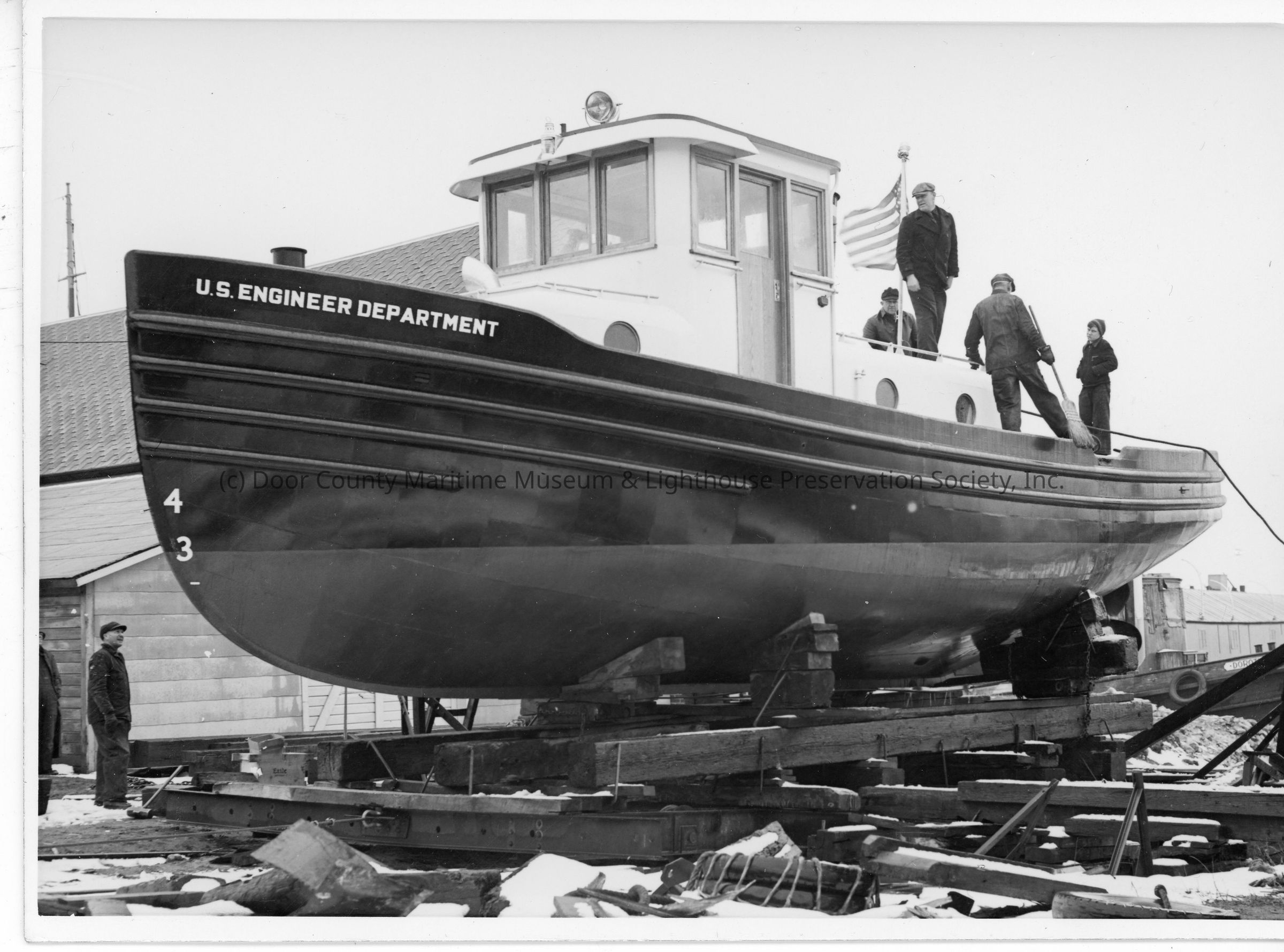 Group of people standing on stern of ACE tugboat in cribbing at SBSB&DD Co.Entry/Object ID