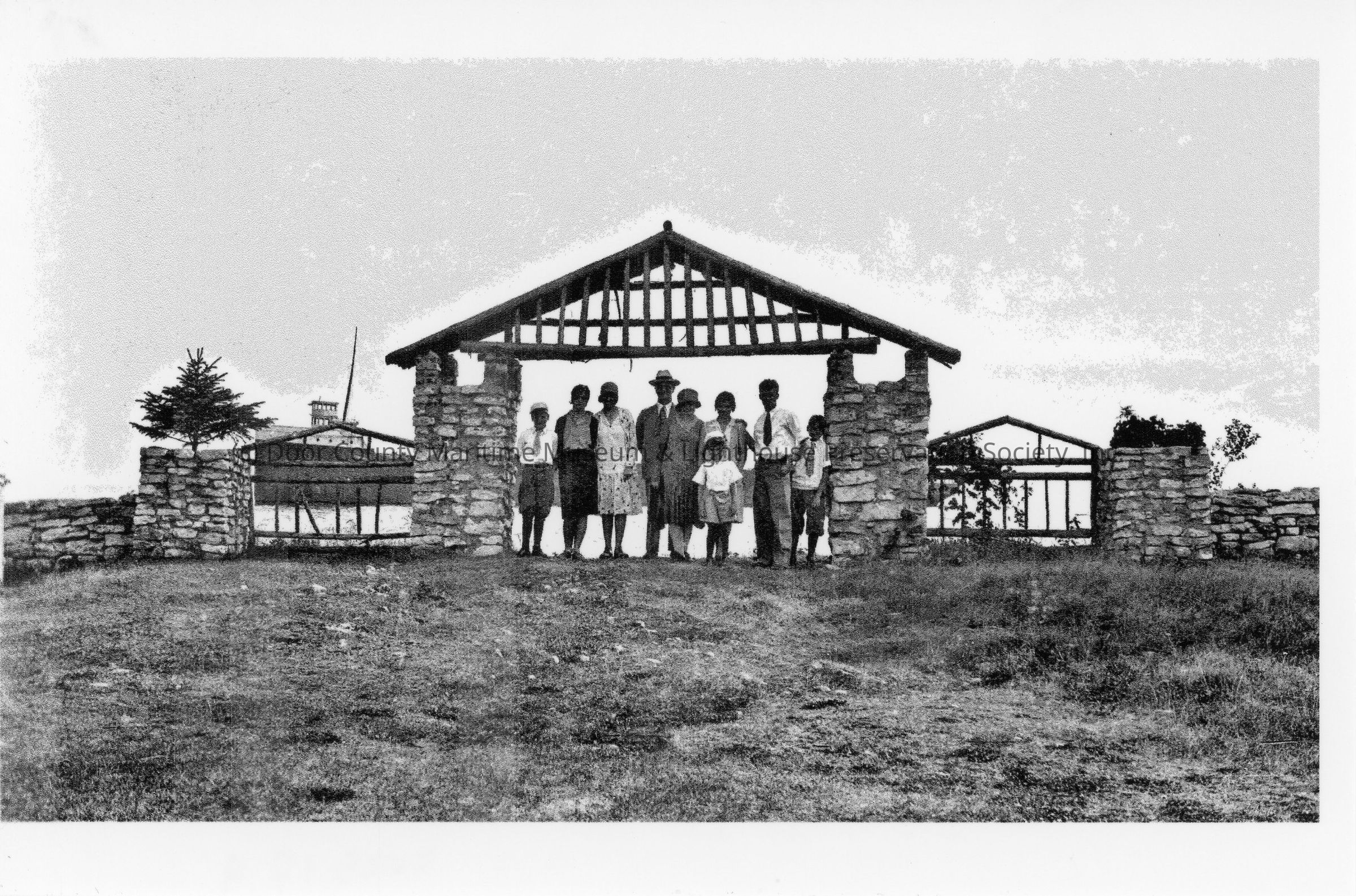 Group of people standing under gate at Cana Island with Bartelme wreckage in background