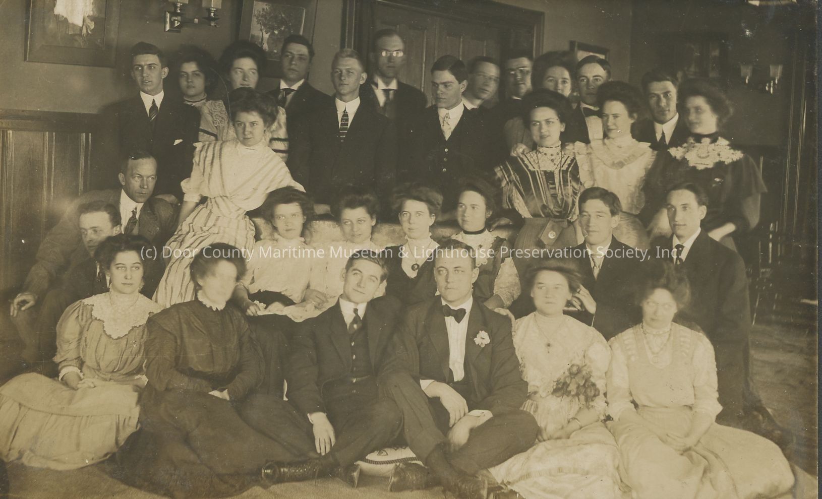 Large group of unidentified, well dressed, young men and women posed for group photo.
