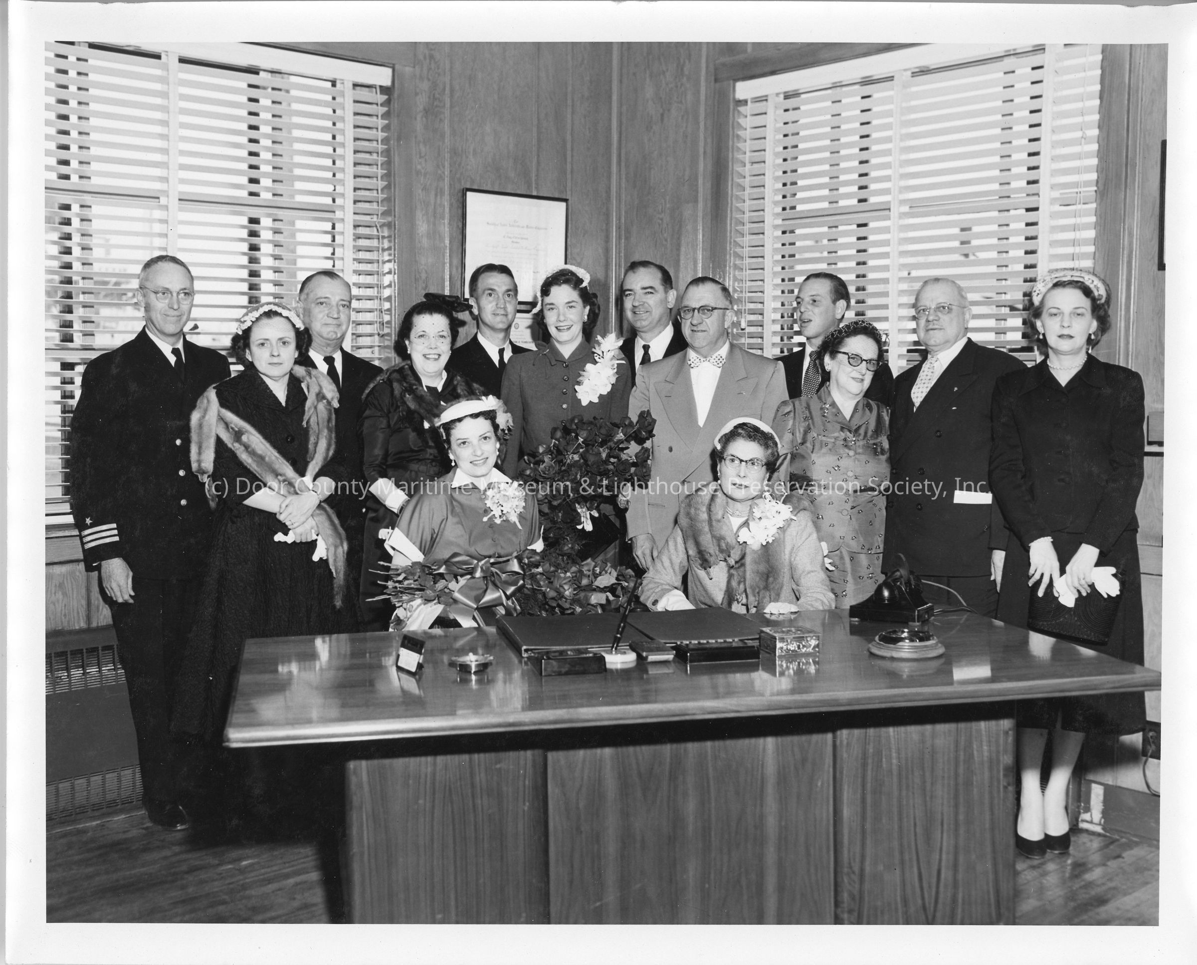 Group standing behind desk at christening of LST-1170, May 22, 1954