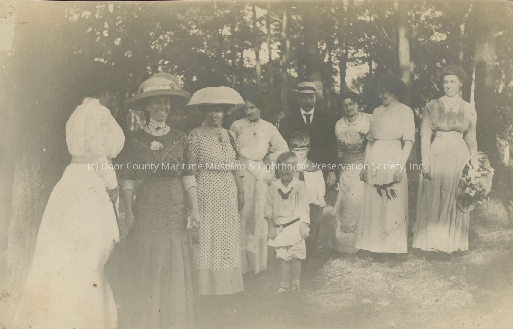 Unidentified group stands for outside photo 7 women 1 man 2 children