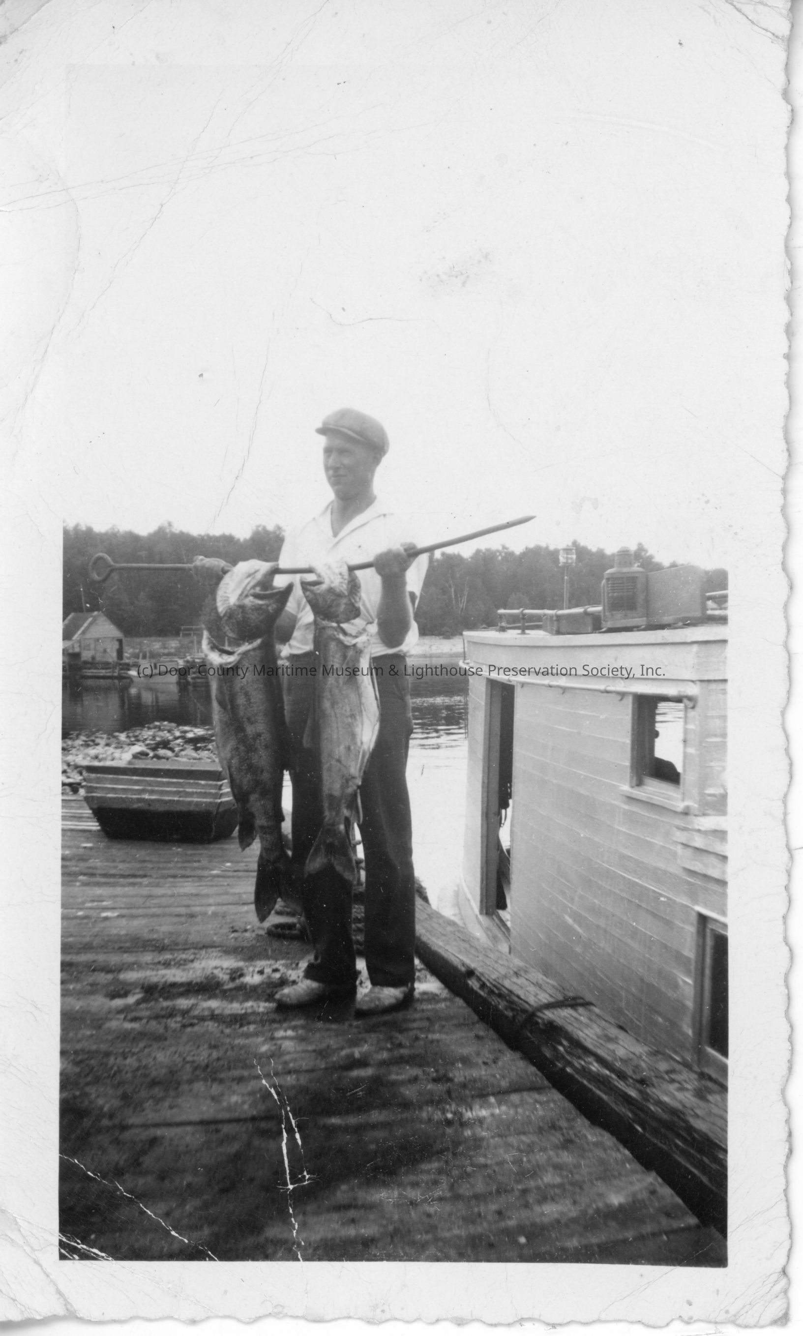 Harvey Hansen two lake trout in front of the docked fishing tug Golden Girl in Gills rock February 17, 1943Entry/Object ID