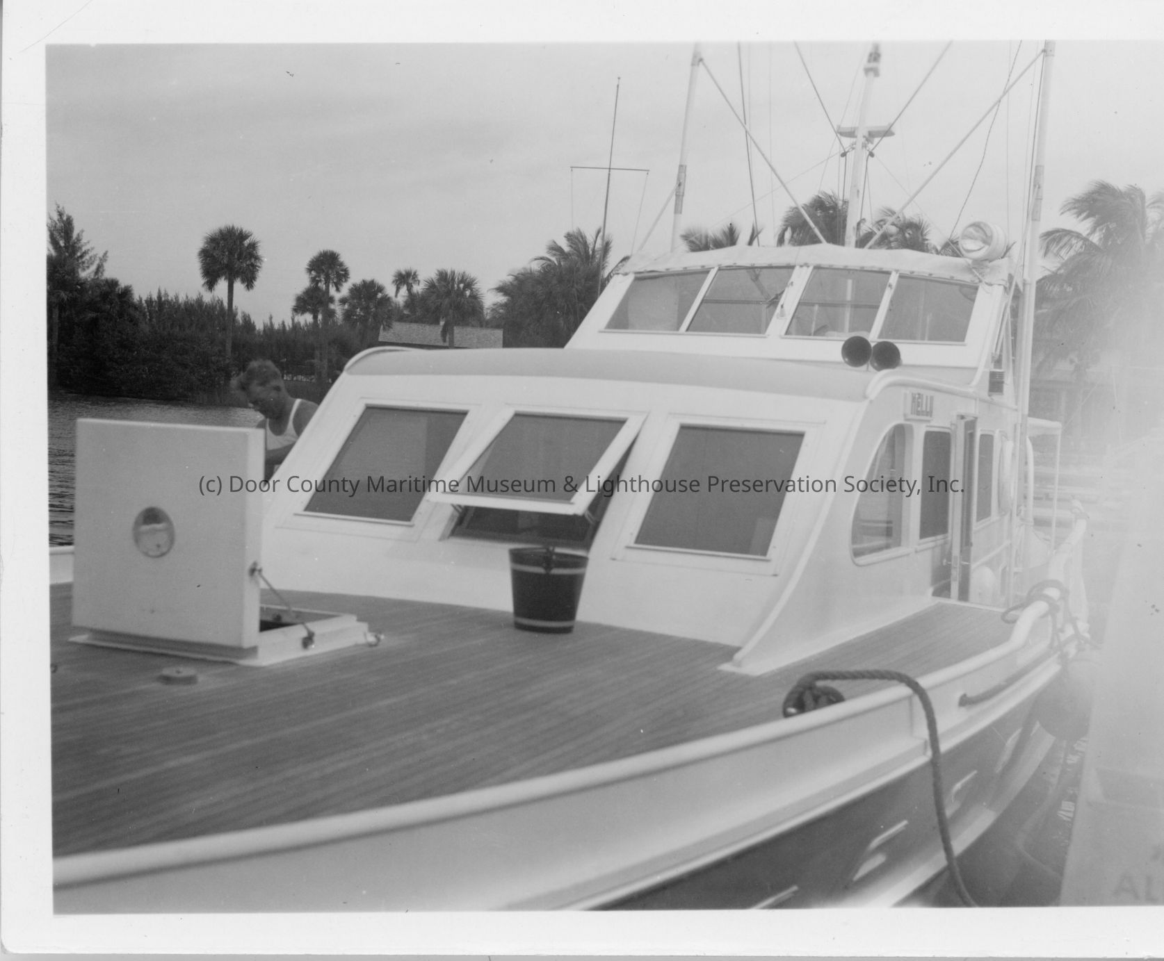 Hellu docked with palm trees in background