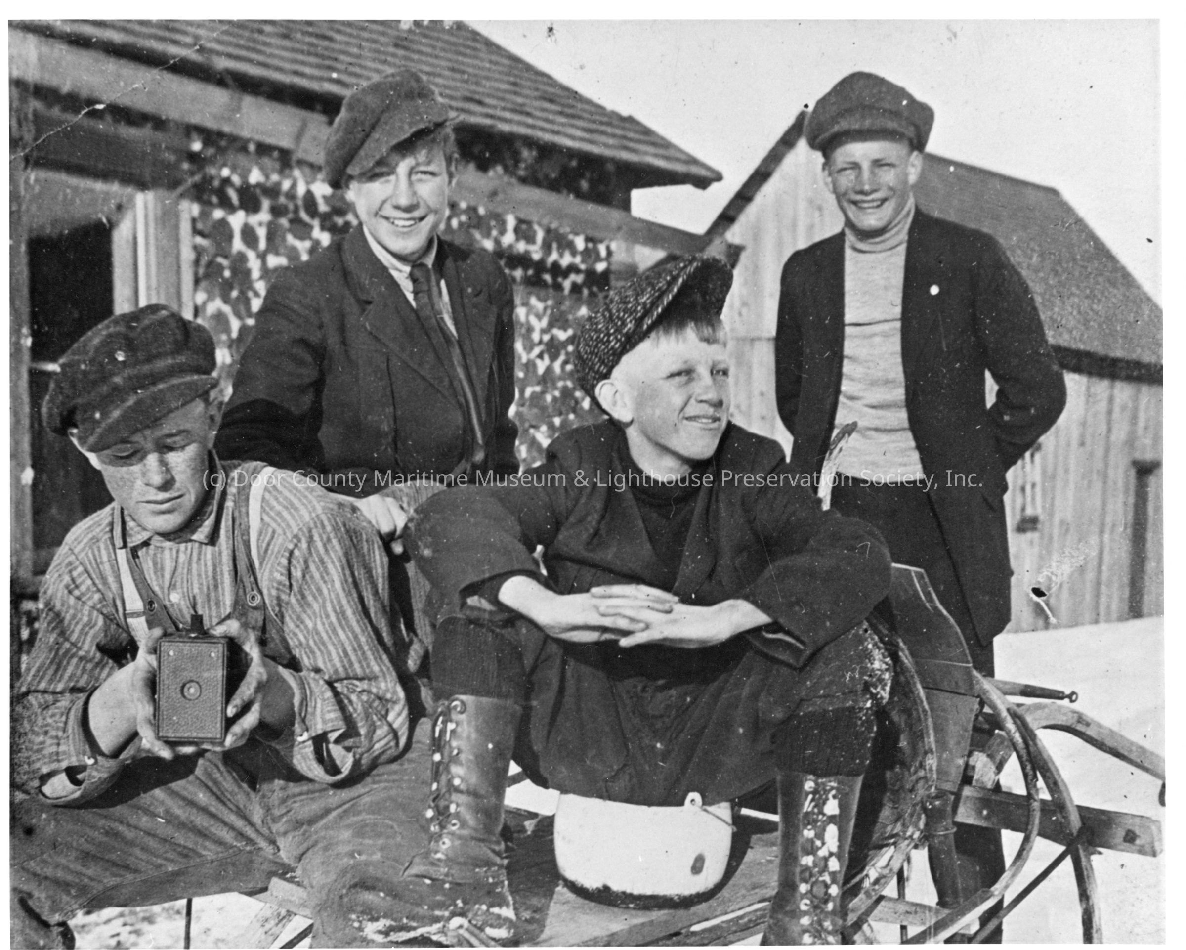 Four boys standing in front of two buildings. Two boys sitting on sledLocation