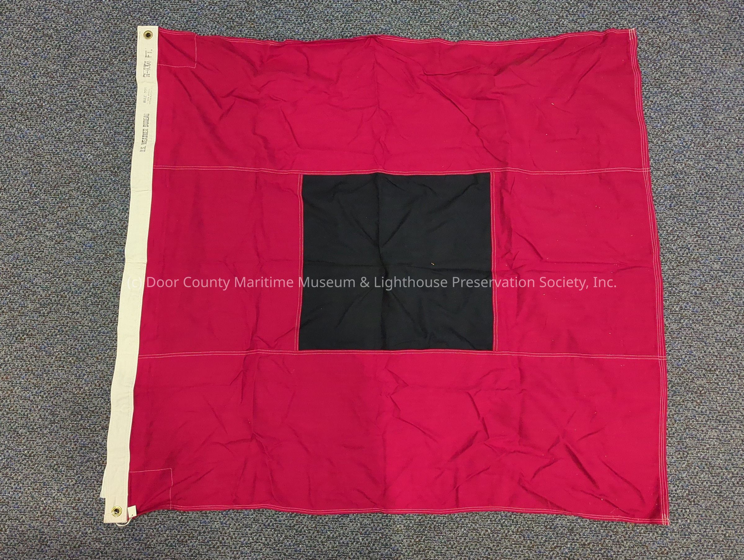 Signal flags (two) 1 & 2 = red with black square in center; white trim on one end; two gold metal eyelets on same end; black print on trim "U.S. Weather Bureau, Bull Dog 100% cotton, R-4 x 4 ft." these are coastal warning flags; two are used for "high gale."Location